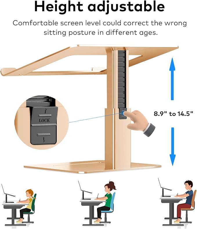 Laptop Stand for Desk, Ergonomic Aluminum Laptop Stand Adjustable Height from 7-15", Sitting and Standing Laptop Riser for 10-17" Notebook (Gold)