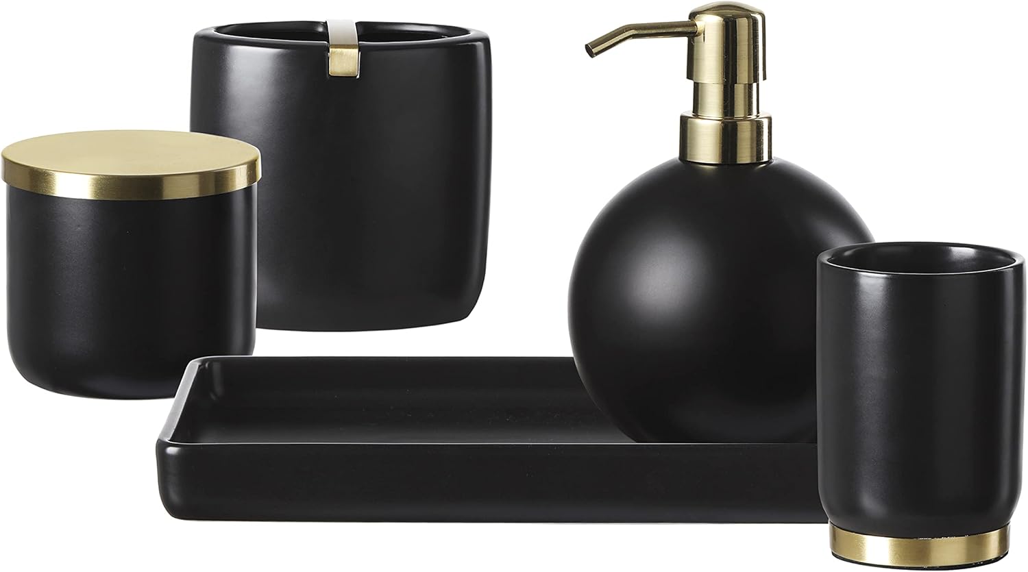 Bathroom Accessories Set, 5-Piece Ceramic Bath Accessory Complete Set with Lotion Dispenser/Soap Pump, Cotton Jar, Vanity Tray, Tumbler and Toothbrush Holder (Black and Gold)