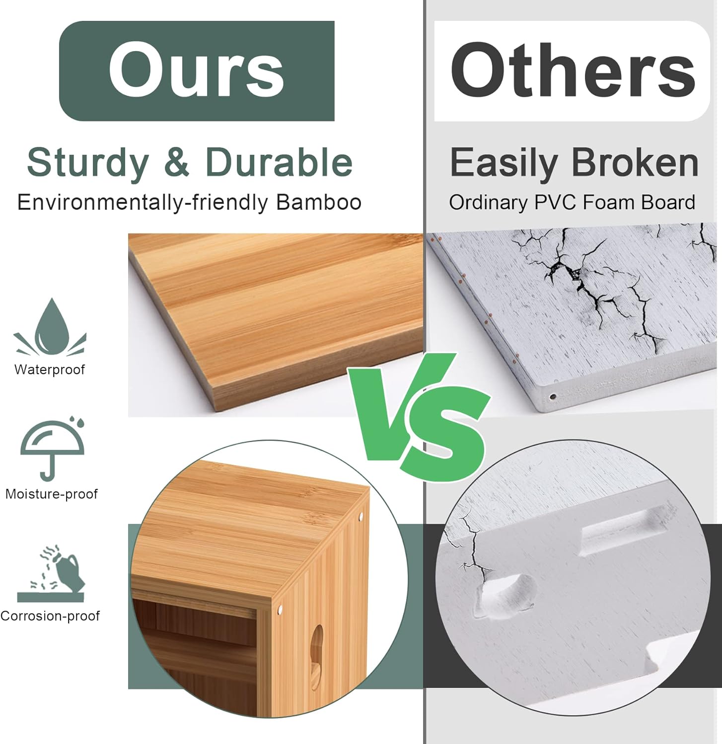 - Upgraded waterproof bamboo toilet paper storage cabinet: Made of premium environmentally-friendly bamboo and with its waterproof coating, AmazerBath small bathroom storage cabinet is much sturdier and more durable than other easily-broken PVC foam boards.