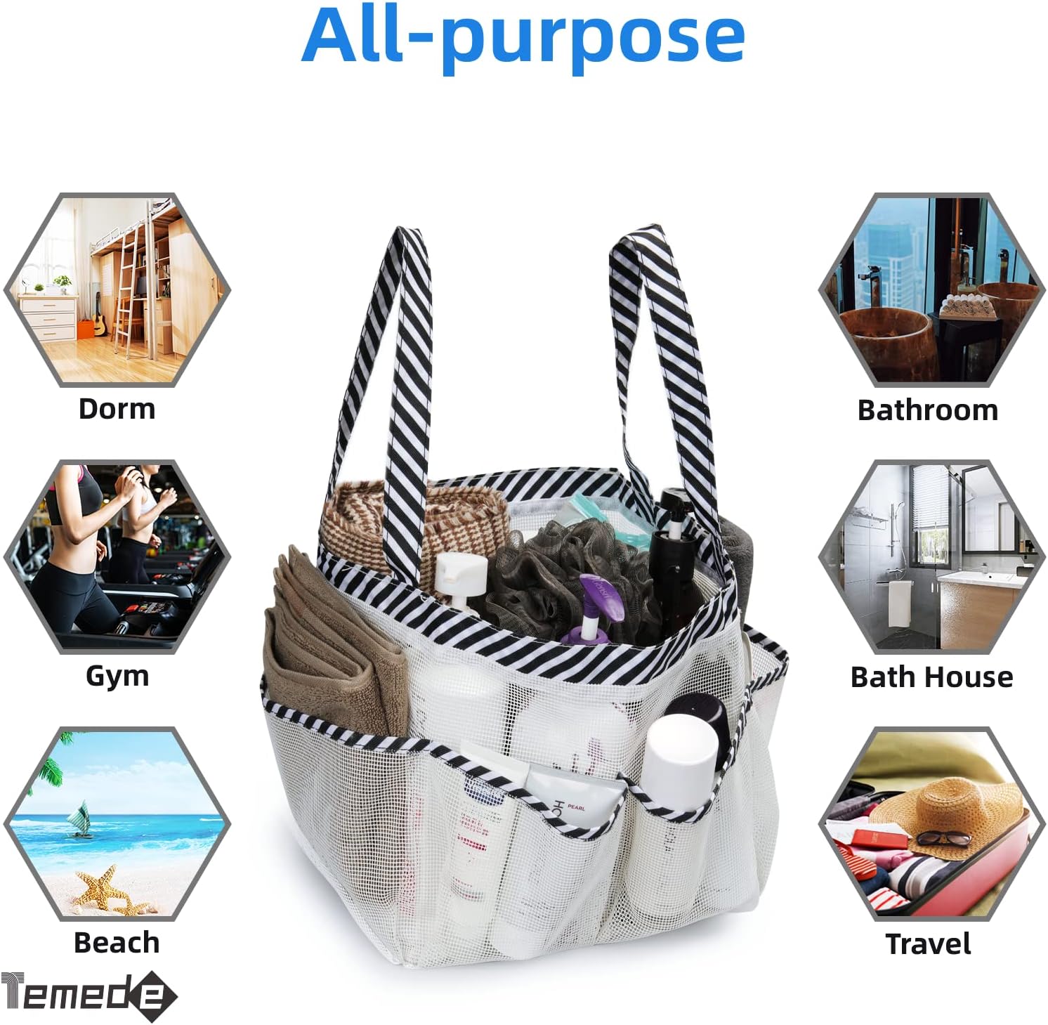 - Multi-purpose: This portable shower bathroom organizer handbag is durable and stylish. Perfect for the college dorm, gym, school, swimming pool, beach, camping, outdoor travel and home or use it as diaper bags, bath toy net and storage organizers. Ideal for family, friends, kids, college students, men and women