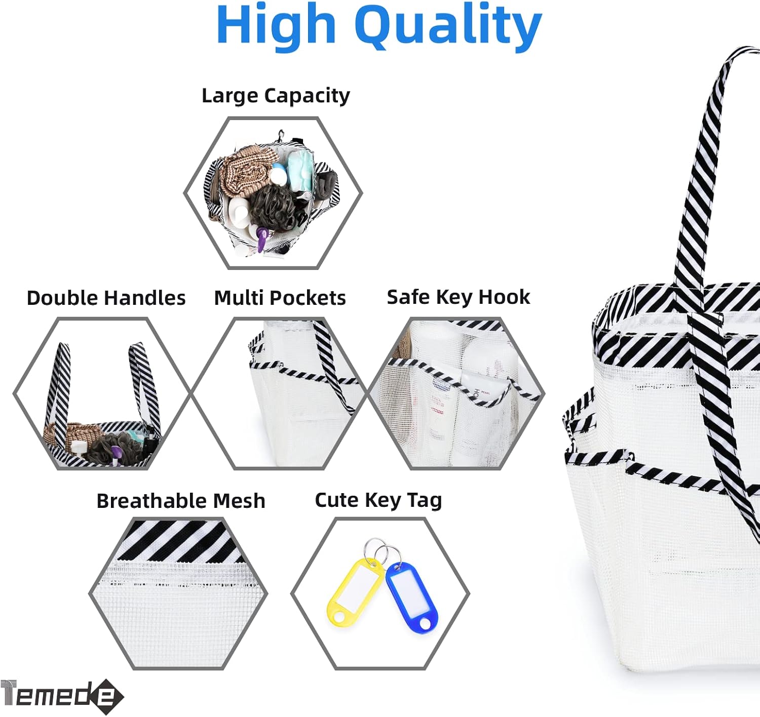 Temede Mesh Shower Caddy Portable for College Dorm Room Essentials, Large Capacity Shower Caddy Basket with 8 Pockets, Quick Dry Shower Tote Bag for Beach, Gym, Bathroom, Camp, Travel-White