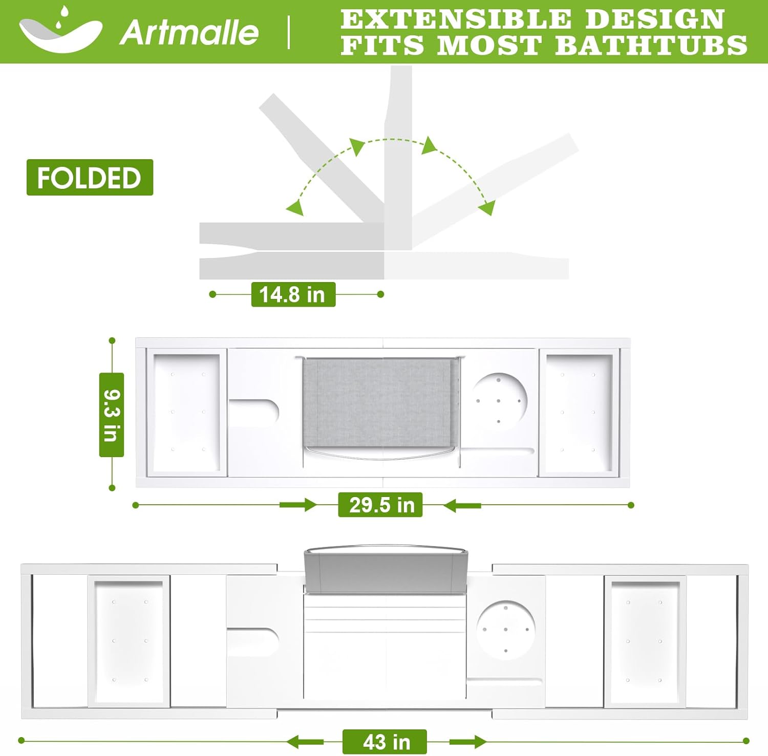 Artmalle Bathtub Caddy Tray - Expandable and Foldable Bath Tray for Tub, Luxury Bamboo Bath Caddy Tub Table, Bathtub Accessories with Book Holder and Free Soap Dish, White