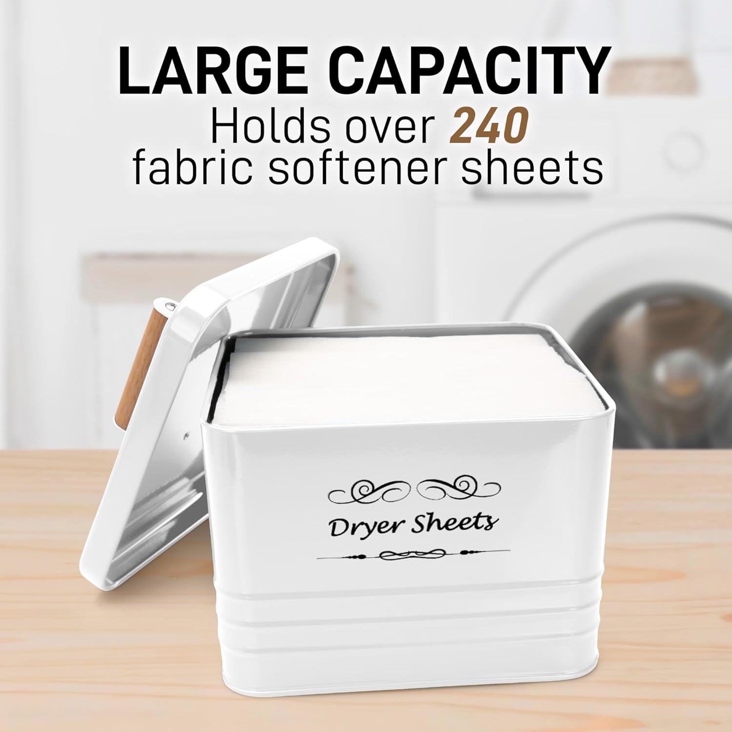 - PREMIUM QUALITY & IDEALLY SIZED: Made with high-quality tin metal, this dryer sheet holder is perfect for everyday use. It also comes with a wooden handle and a lid to keep the laundry sheets fresh. This laundry sheets holder measures 7 * 6 * 5 inches and can store up to 240 standard-size fabric softener sheets.