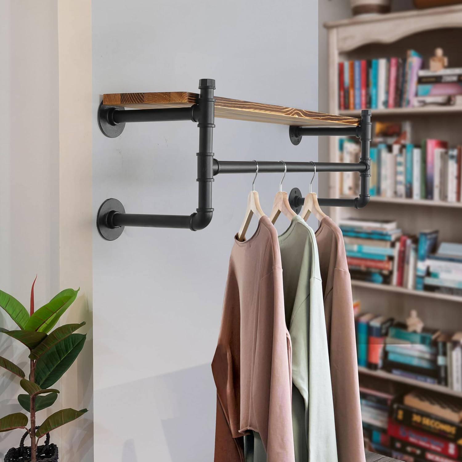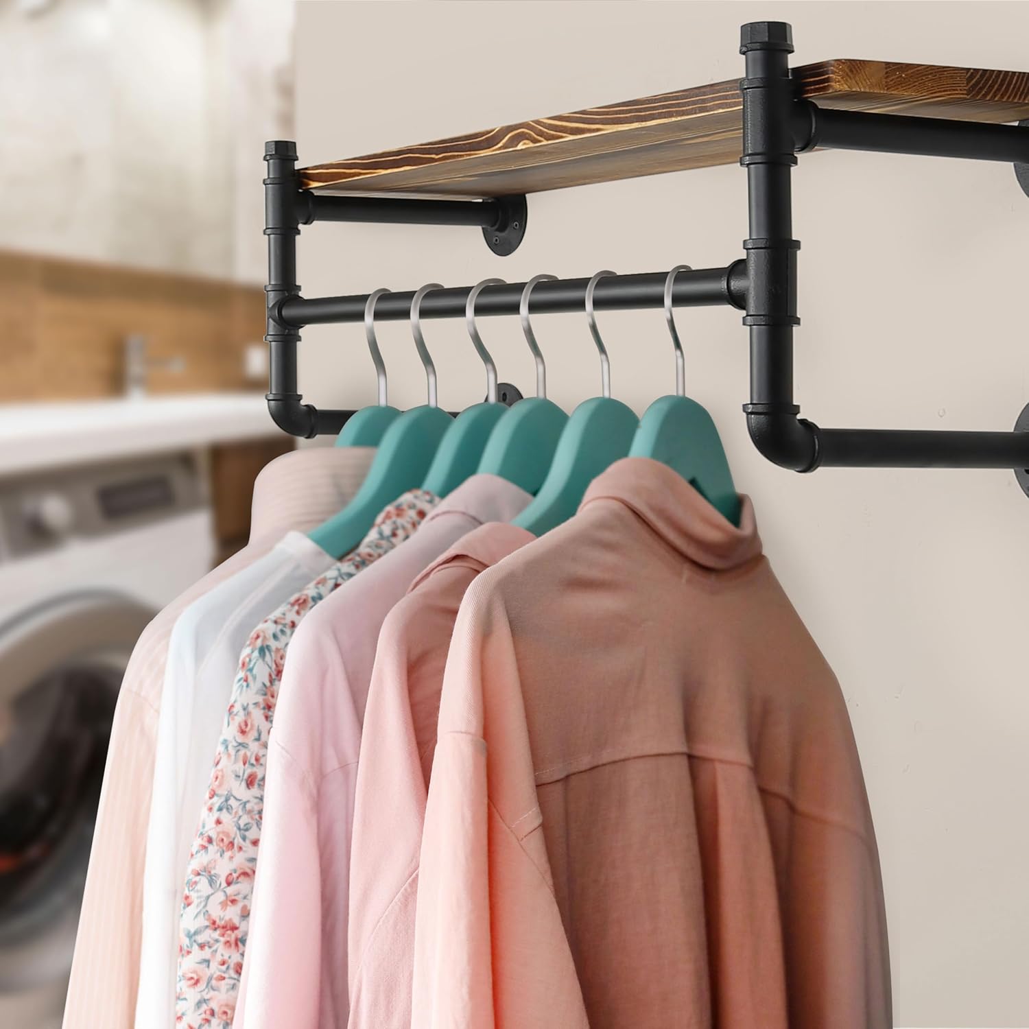 - 【Large Size】:The long industrial pipe clothing rack with solid wood shelf can accommodate lots of clothes/dresses in laundry room,closet,hallway,entryway, bedroom balcony,clothing retail store.