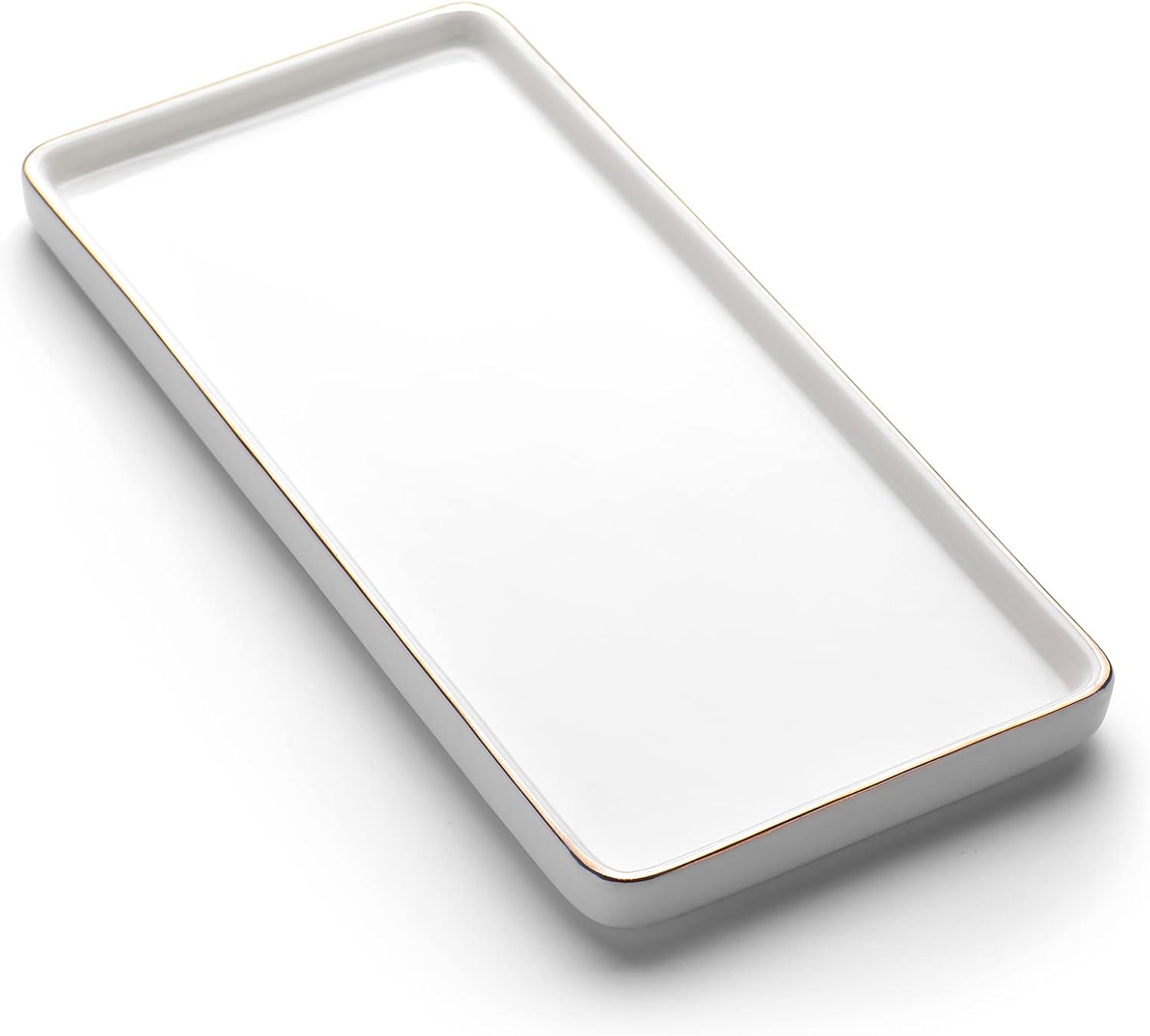 Gurygo 8" Bathroom Tray, Ceramic Vanity Trays for Bathroom, Small Ceramic Trays, Kitchen Soap Tray for Kitchen Counter (White with Gold-Edged, 8",Set/1)
