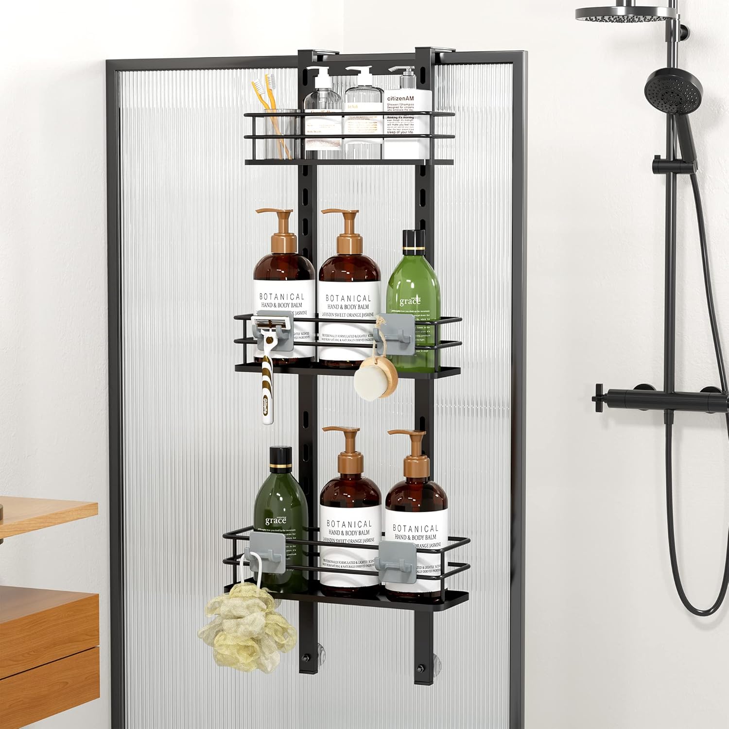 Orimade Adjustable Hanging Over the Shower Door Caddy with Hooks, Bathroom Organizer Shelf Storage Rack,No Drilling Rustproof Basket for Inside Shower, Matt Black 3 Tier