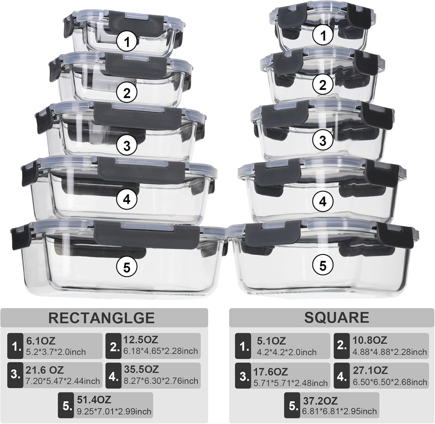 - 20 PIECE GLASS CONTAINERS SET: 10 Containers with 10 lids , Package includes: RECTANGLE — 51.4OZ,35.5 OZ,22 OZ,12.5OZ,6.1OZ. SQUARE — 37.2OZ,27 OZ,17.6 OZ,10.8 OZ,5.2 OZ. glass storage containers with Locking lids.It contains two large-capacity containers, which can hold more food, and it is easier to hold larger food. There is no need to chop and store, which can extend the preservation time.