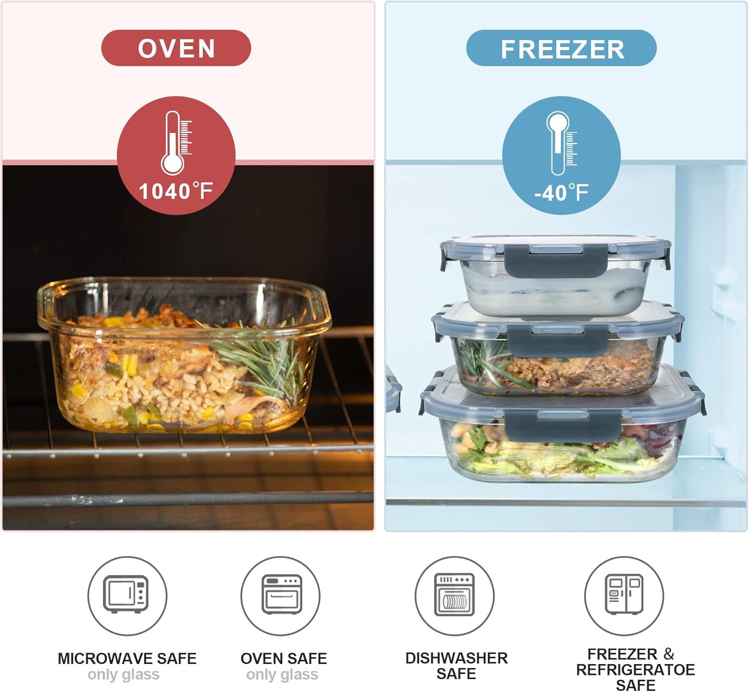 - OVEN/MICROWAVE/FREEZER/DISHWASHER SAFE-from -40℃/-40℉ in freezer to 400℃/752℉ in oven, Our glass storage containers are made from high quality borosilicate glass, which are oven safe over to 752℉, you can use them for freezer storage,microwave(not the lids)and dishwasher.The glass containers and lids are dishwasher safe, but it is recommended to hand-wash the removable lids for a longer lifespan.