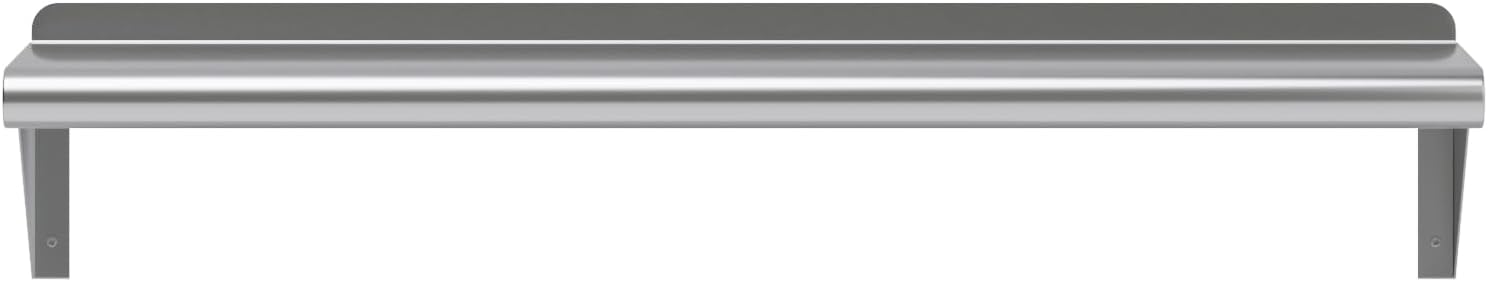 - 18 gauge 430 stainless steel shelf top, and stainless steel shelf mounting brackets. Bullnose Edge. 1" Backsplash. Shelves are available in sizes ranging from 24” to 84” and width ranging from 10” to 18”. All shelves come with 2 support brackets (3 brackets for shelves over 72” long). Professional and sleek look make this space saving shelf a good fit in commercial or residential environment.