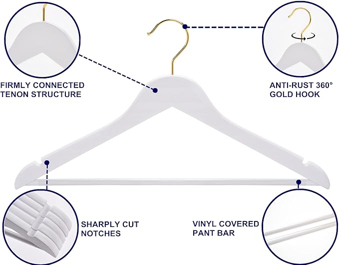 - 【PRACTICAL FEATURES】These luxurious clothes hangers are made of smooth white wood with all practical features as a anti-rust 360° gold hook, a grooved, vinyl covered pant bar, and a contoured shoulder line with perfectly cut notches.