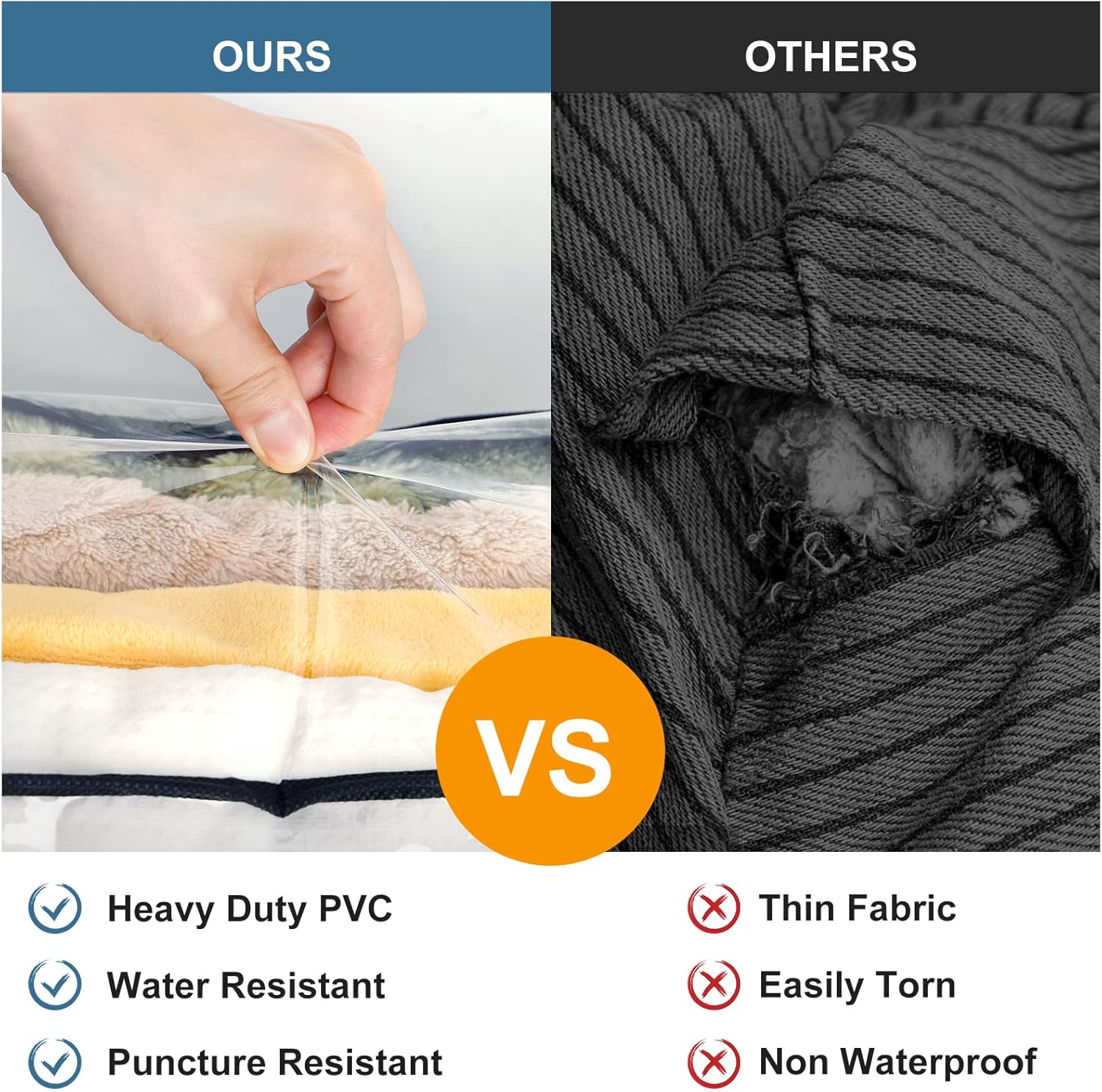 - Extremely Sturdy: The blanket storage bags is made from heavy-duty PVC material, which is thick enough to protect against water and dust. Transparent design allows you to see what is stored and where it is. Pillow storage is thick; sturdy; and offers superior toughness, tear resistance, and abrasion resistance compared to ordinary plastic, It's great for storage; moving; shipping; laundry and much more