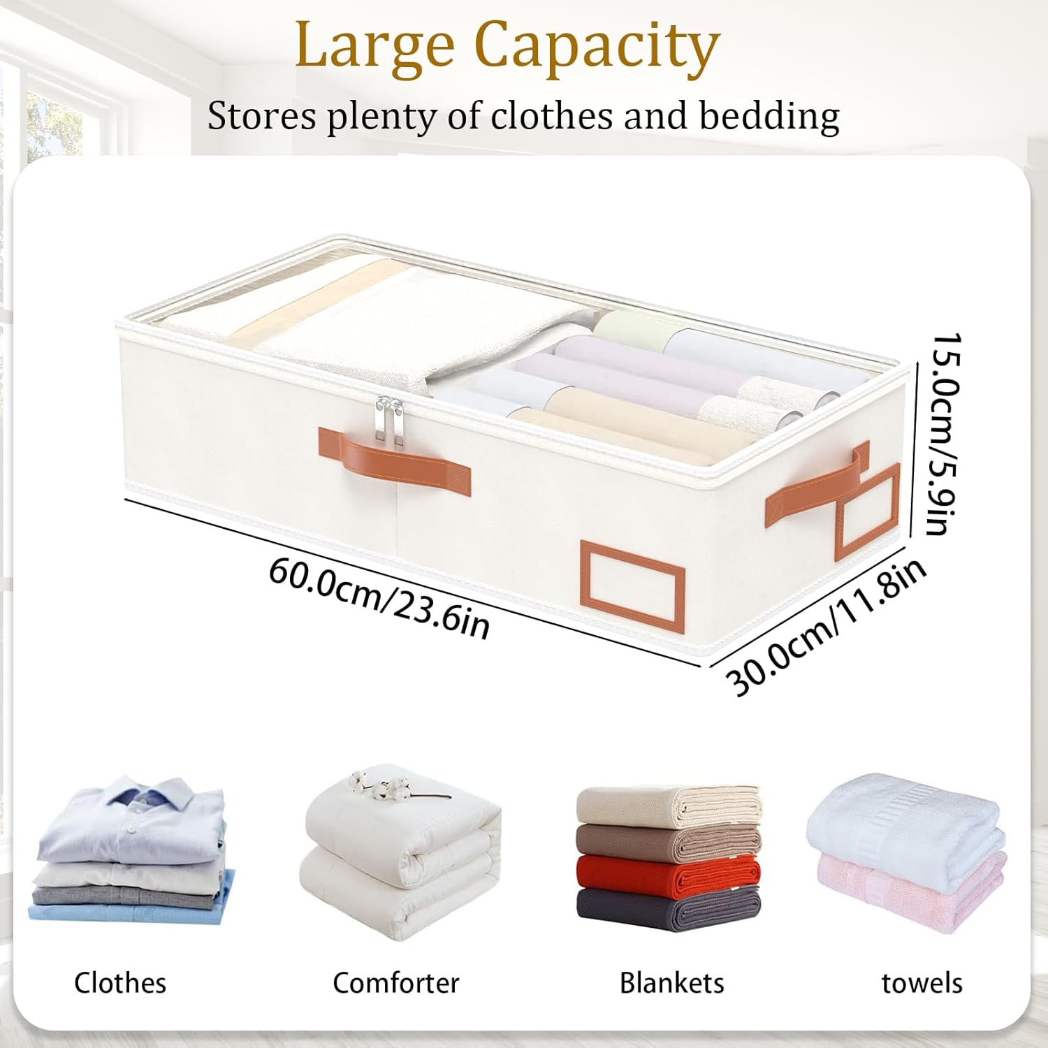Yawinhe Under Bed Storage, 2 Pack Closet Organizers, Collapsible Container Bags, with Sorting Card Slot and 4 Leather Handles, for Blanket, Bedding, 23.6''Lx11.8''Wx6''H, Beige