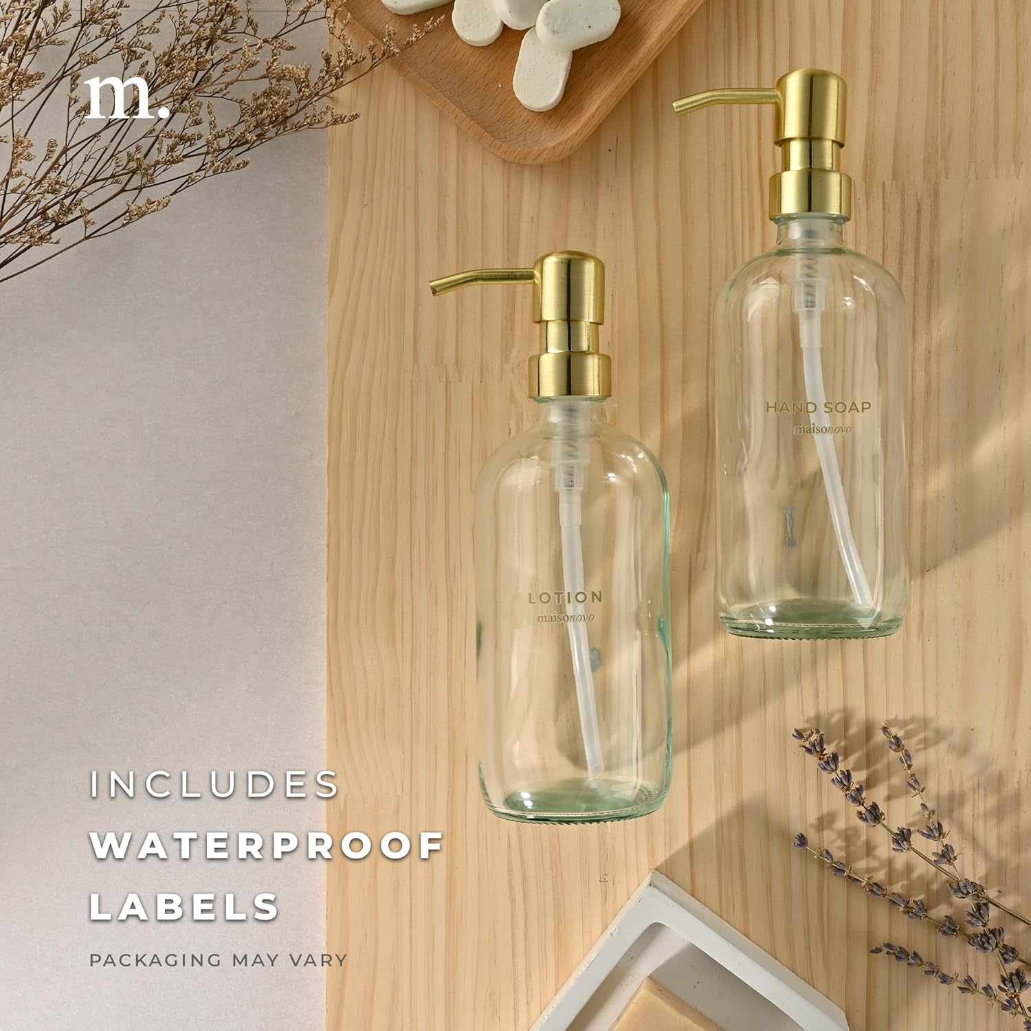 - This Pack Includes: This premium 2 16.9 Oz/500ml clear glass soap dispenser with pumps set boasts gold 2cc stainless steel pumps, combined waterproof labels. Ideally suited for any kitchen or bathroom, it works as a bathroom soap dispenser set or a kitchen soap dispenser set.