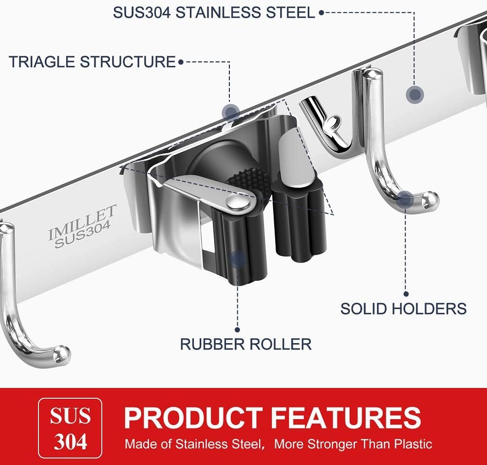 - STRONG & STURDY: Broom Holder wall mount is made of 304 stainless steel, corrosion-resistant, moisture proof and waterproof. Compared with the plastic broom rack, it's more stronger and sturdy. And this broom hanger wall mount can hold up to 200 pounds