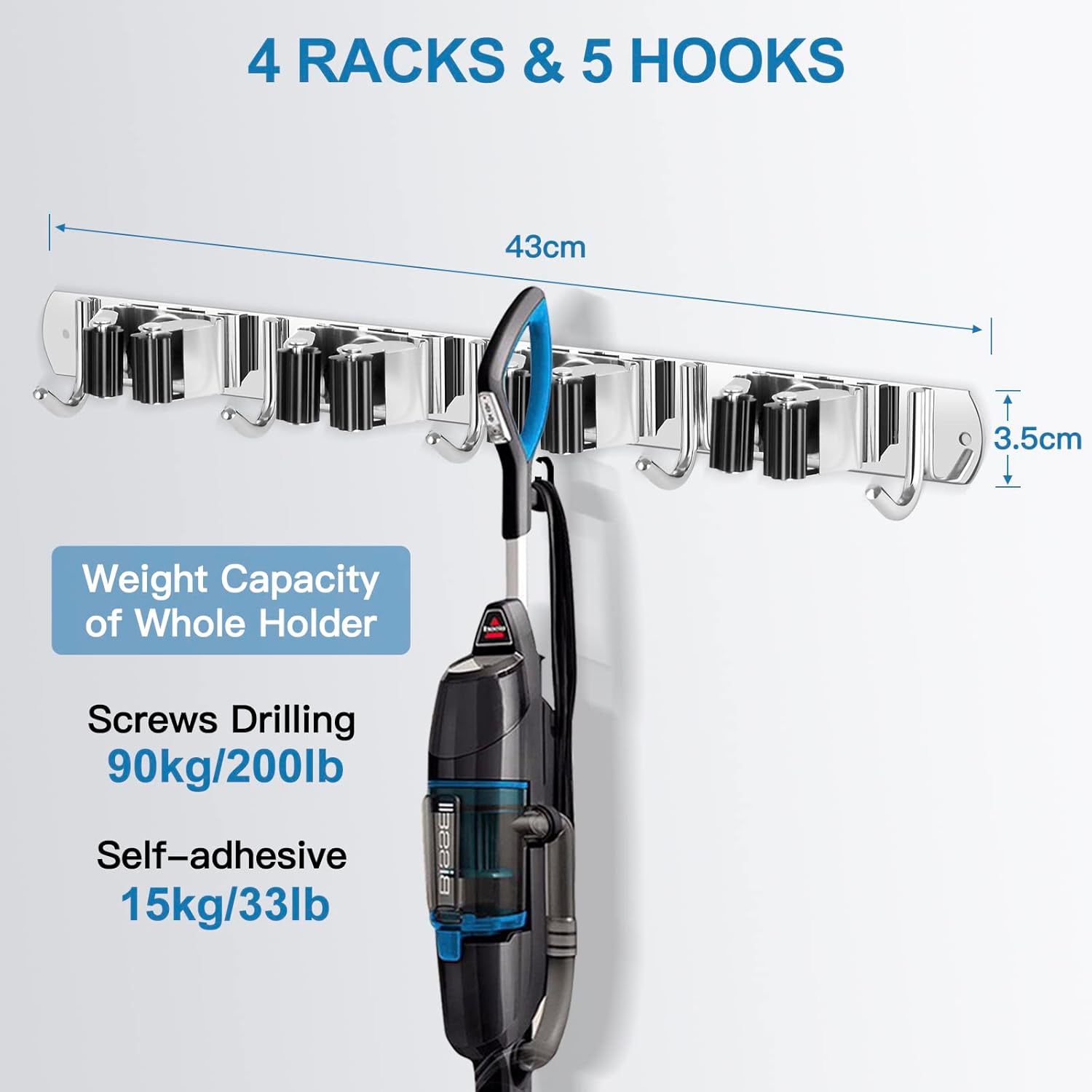 IMILLET Broom Holder Wall Mounted, Stainless Steel Broom Mop Holder Self Adhesive Heavy Duty Hooks Storage Organizer for Home Laundry Room Garden Garage Closet Kitchen 1 Pack(4 Racks with 5 Hooks)