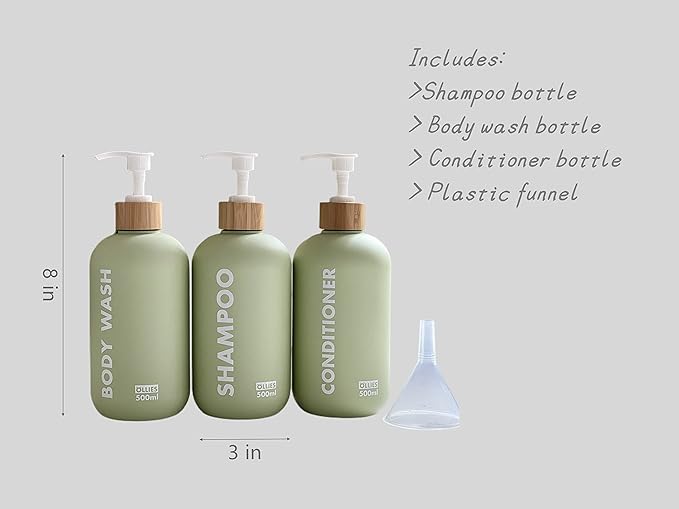 - THIS SET INCLUDES: 3 elegantly designed plastic bottles for shampoo, conditioner, and body wash. It also comes with a free funnel.