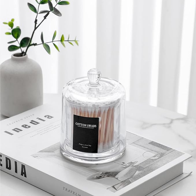 - Ideal Size Bathroom Accessories: rejomiik qtip holder Item Includes 2 packs, 3.31" Wide, 4.41" Height, Clear glass jar with lid dispenser for such as Q-tip, cotton ball, cotton swab, cotton rounds, floss picks, tampon, bath salts, hair tie band, makeup brush, beauty egg, face brush, crayons, candy, pens, clip, and more small things