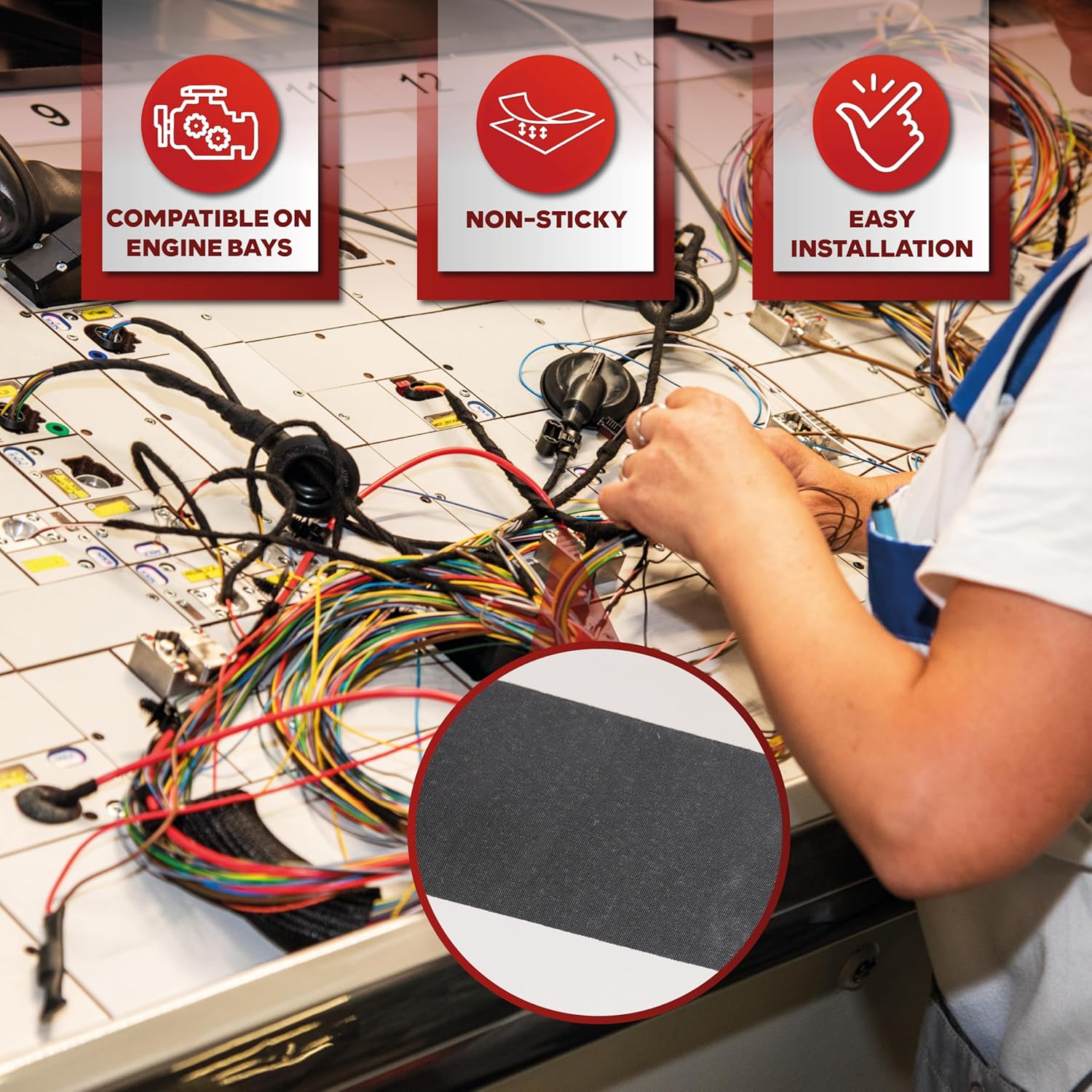 - High temp Wire Harness Automotive Cloth Tape with excellent sound and rattle dampening performance. Lessens coil whining and lasts well against elevated temperatures (-40℉ - 257℉).