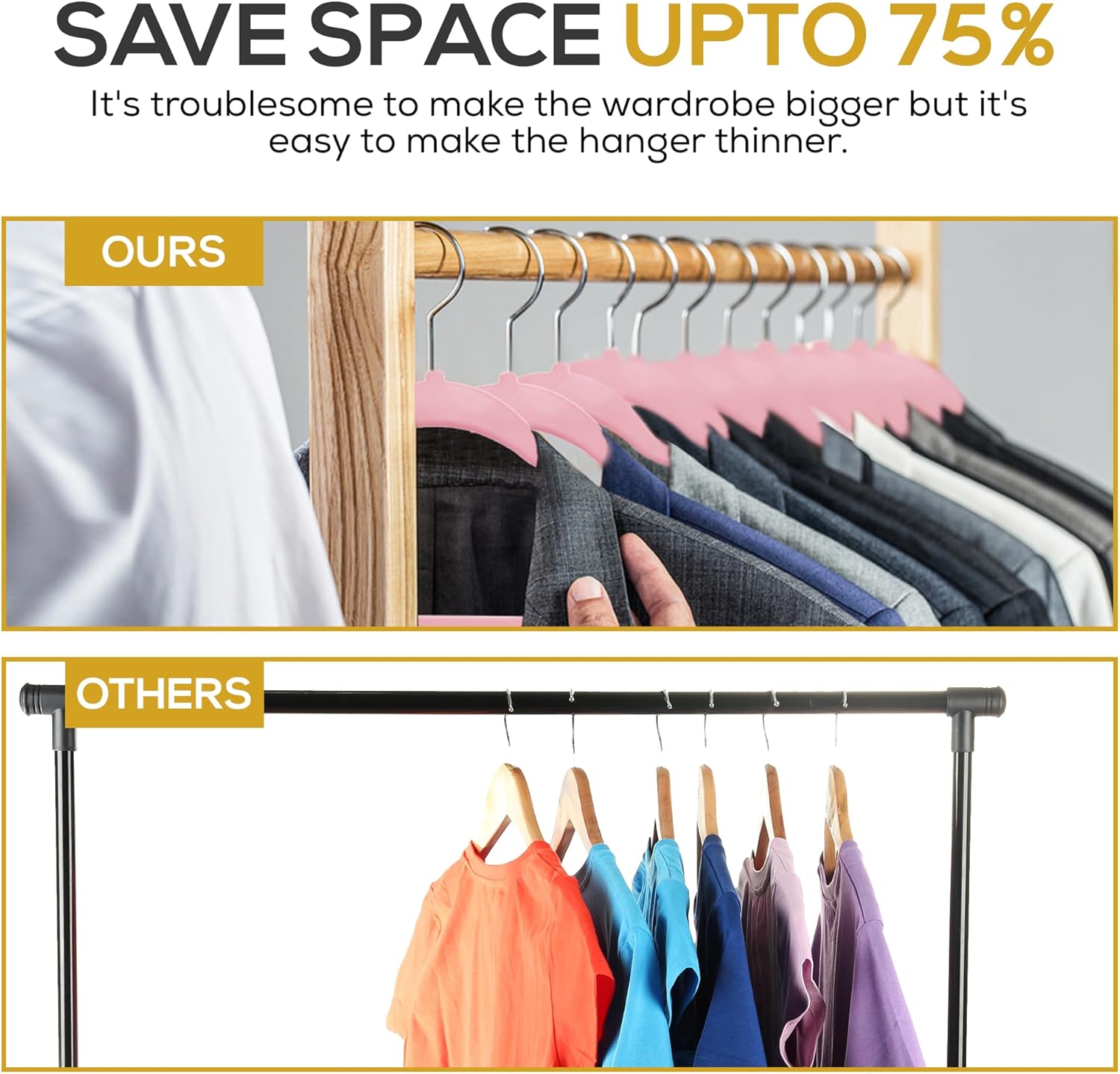 Premium Velvet Hangers 50 Pack Ultra Thin Non Slip Adult Felt Space Saving Suit Hanger for Closet Heavy Duty Coat Pants Jackets Dress Hangers 360° Swivel Hook Hold Upto 10 lbs Pink