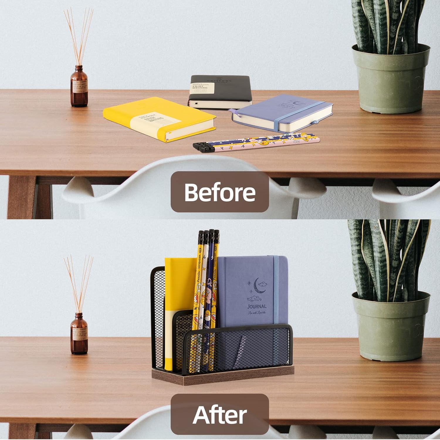 Wooden Desk Mail Organizer, Desktop File Organizer Metal Mesh with 3 Vertical Upright Compartments, Mail Sorter Letter Organizer Rack for Letters, Postcards, Brochures, Mail Holder (2 Pack Black)