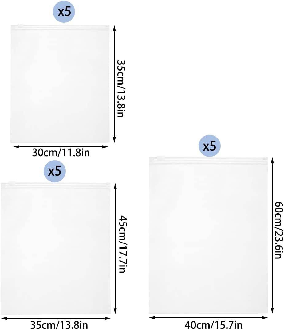 - 【Package & Size】15 pcs in total, including 3 sizes, 12x14 inch, 14x18 inch, 16x24 inch 5 pcs each. Large frosted zipper poly bags store everything to keep your life organized.