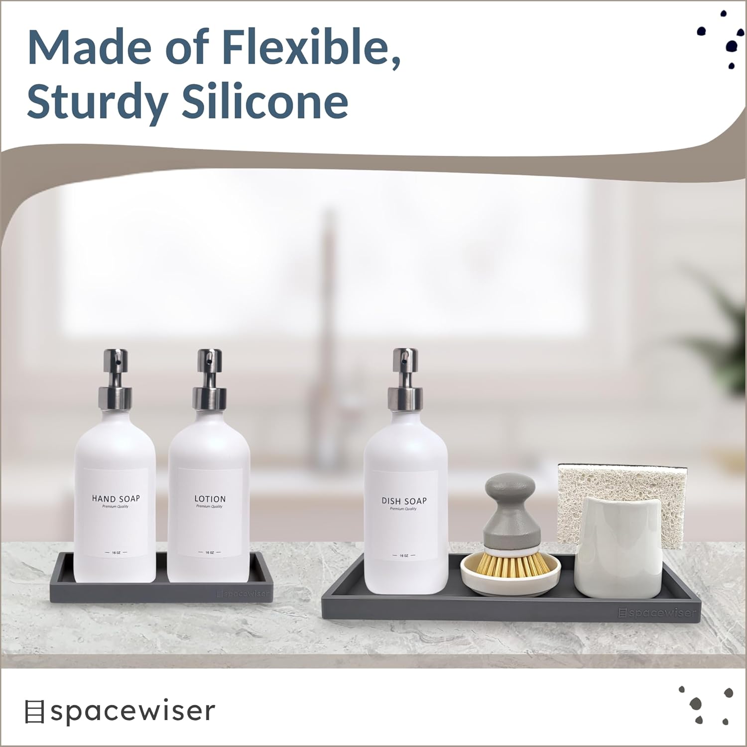 - Use Them Anywhere – Choose the endlessly useful and aesthetically pleasing trays that work anywhere. Spacewiser Original Silicone Trays work perfectly as a bathroom tray, vanity tray or kitchen sink tray. Spacewiser trays are made of premium food grade silicone, without the addition of potentially unsafe thickening and hardening agents or chemicals. They’re shatterproof, waterproof, slip-resistant, heat resistant to 425F, and dishwasher safe.