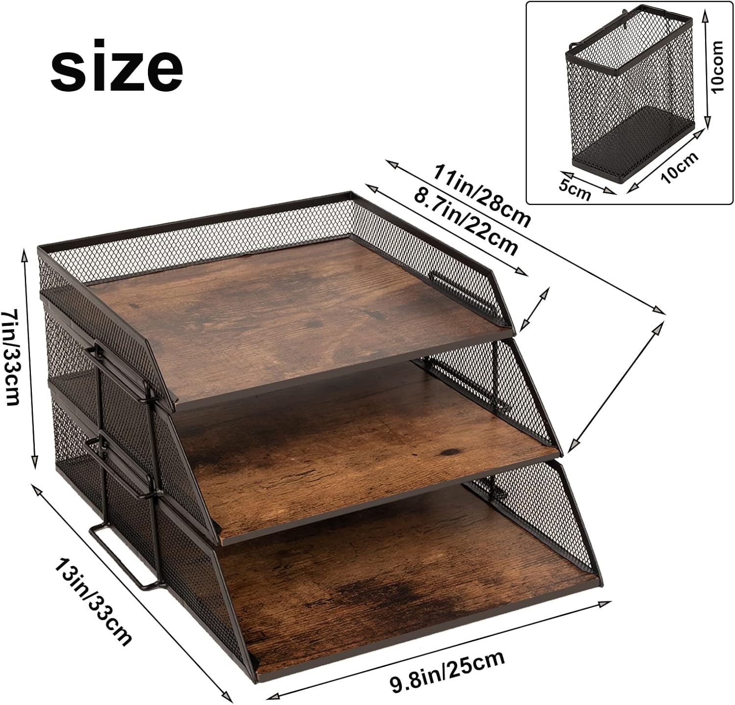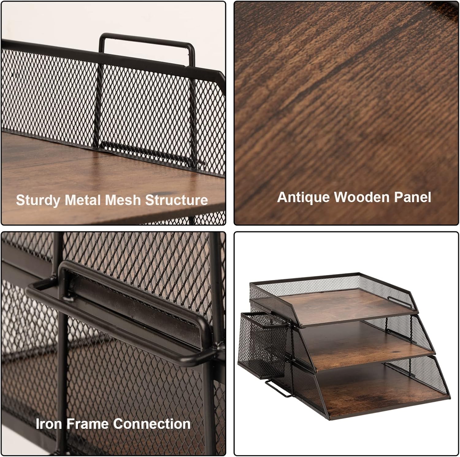 Vintage Wood & Metal Letter Tray, Stackable Desk Organizers Paper Tray, for File Magazines Mail Organizer, Vintage Wood Desk File Organizer with Pen Holder(3 Layer)