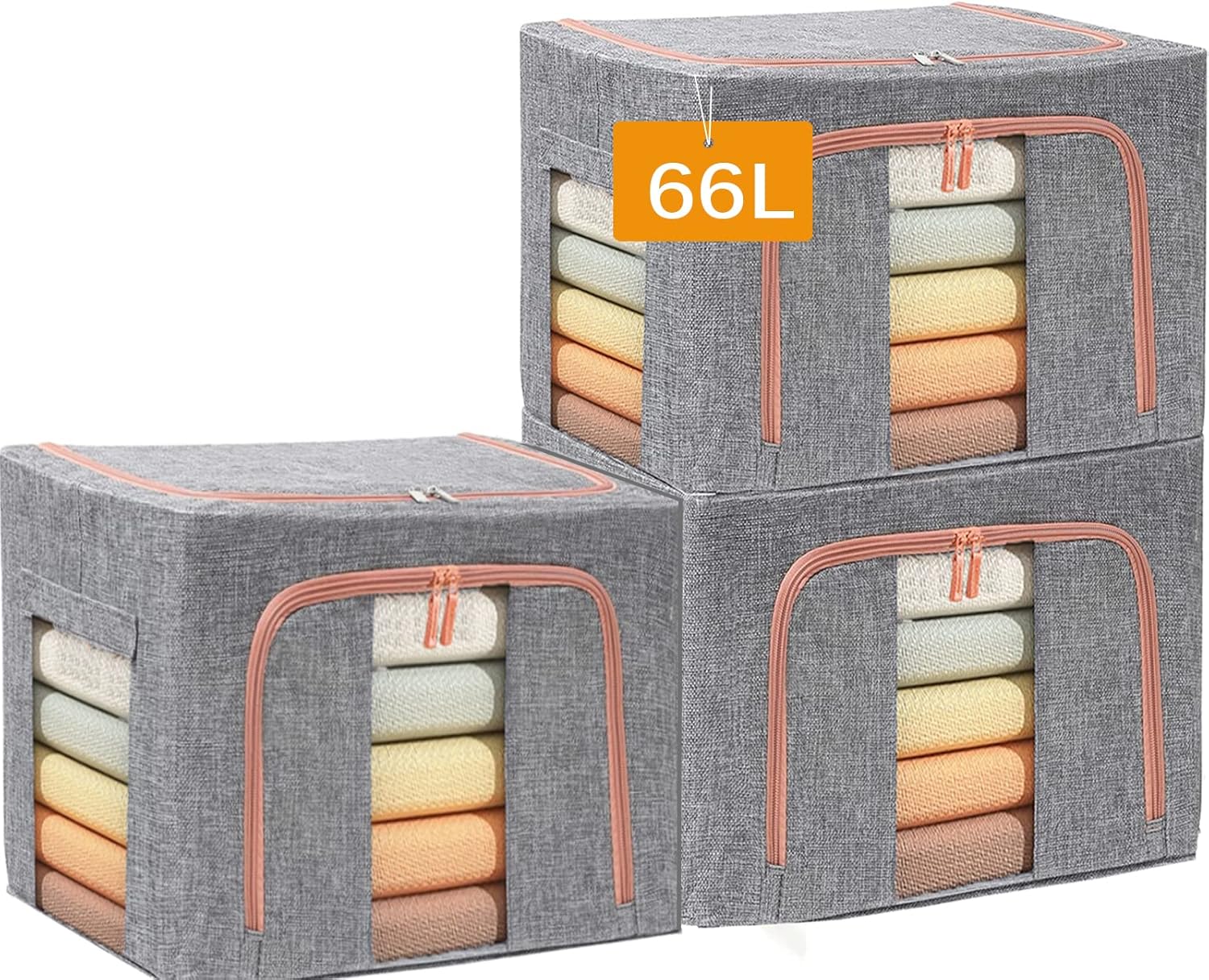 Large Capacity Clothes Storage Bags,Stackable Storage Organizer with Foldable Metal Frame, 2-Way Zipper, Handles, Clear Window for Clothes, Bedding, Seasonal Storage (3Pack, 66L)