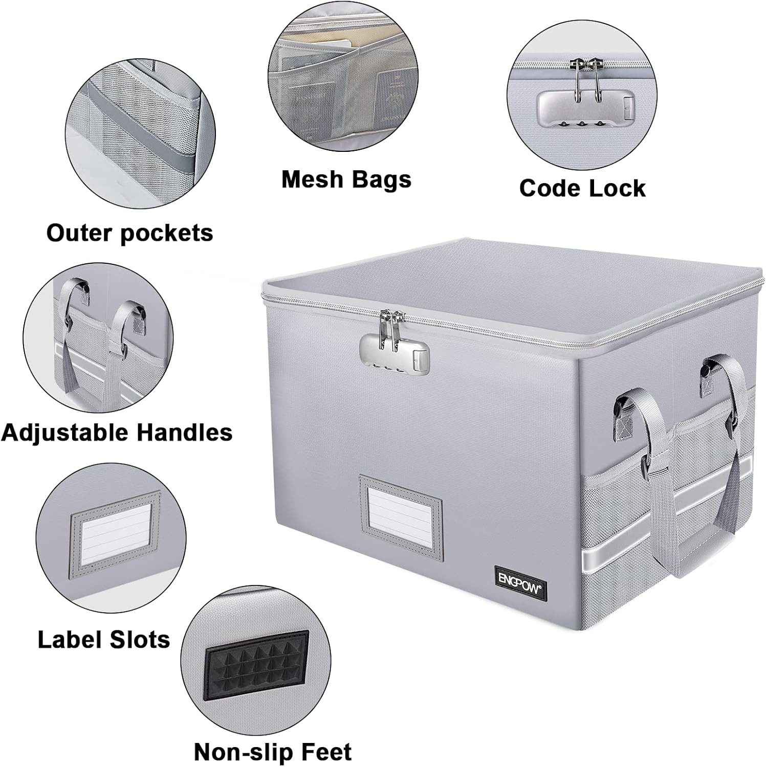 - Portable and secure: High quality combination lock design for added storage security(includes instruction manual). Sturdy adjustable handle makes it easy to carry everything you need, two zippers make it easier to open and close the box, Side pockets and label slots let you store small items and labels.The file lock box collapses down simply for easier storage when not in use. High-quality PP board that can withstand at least 200 pounds of weight, so you don't have to worry about bending.