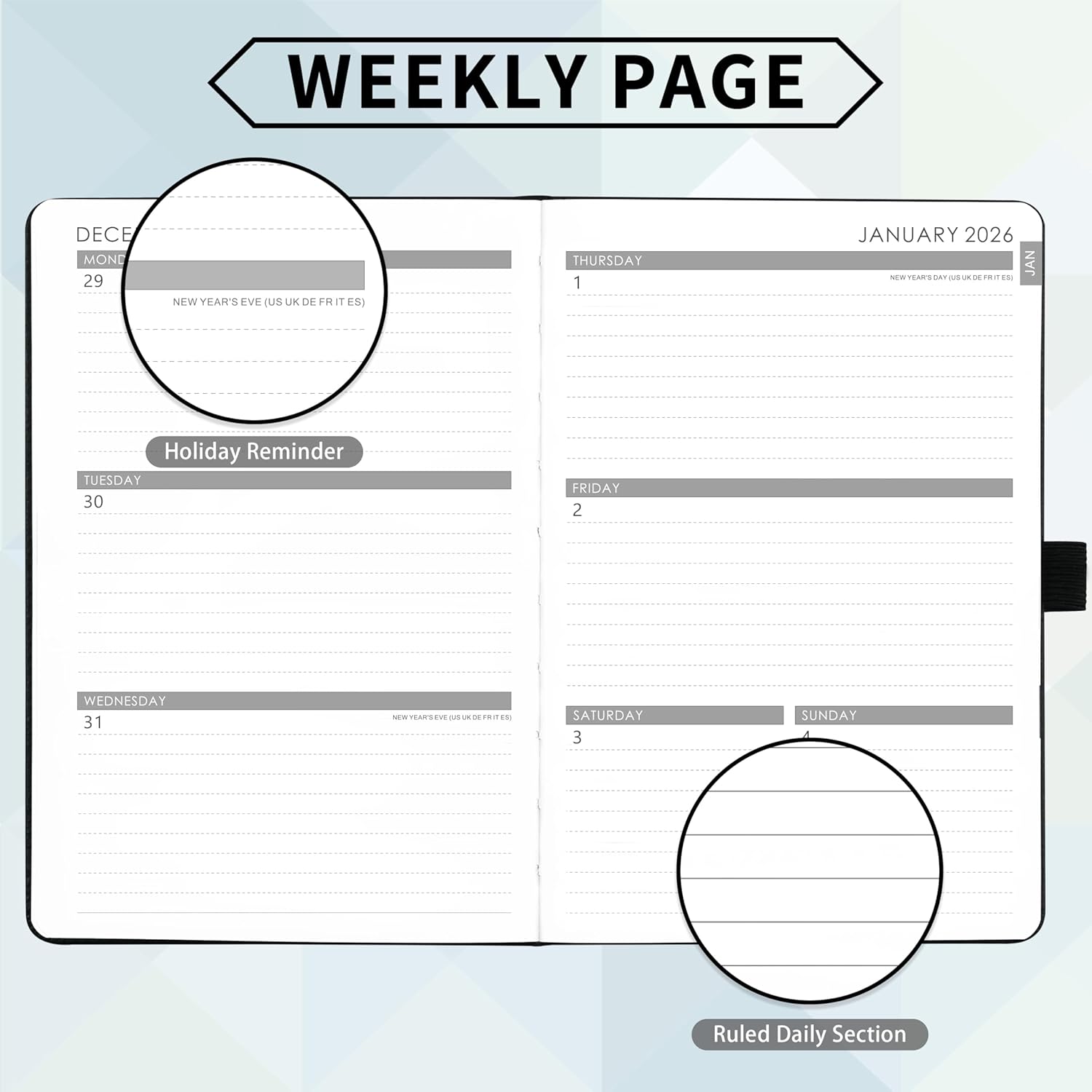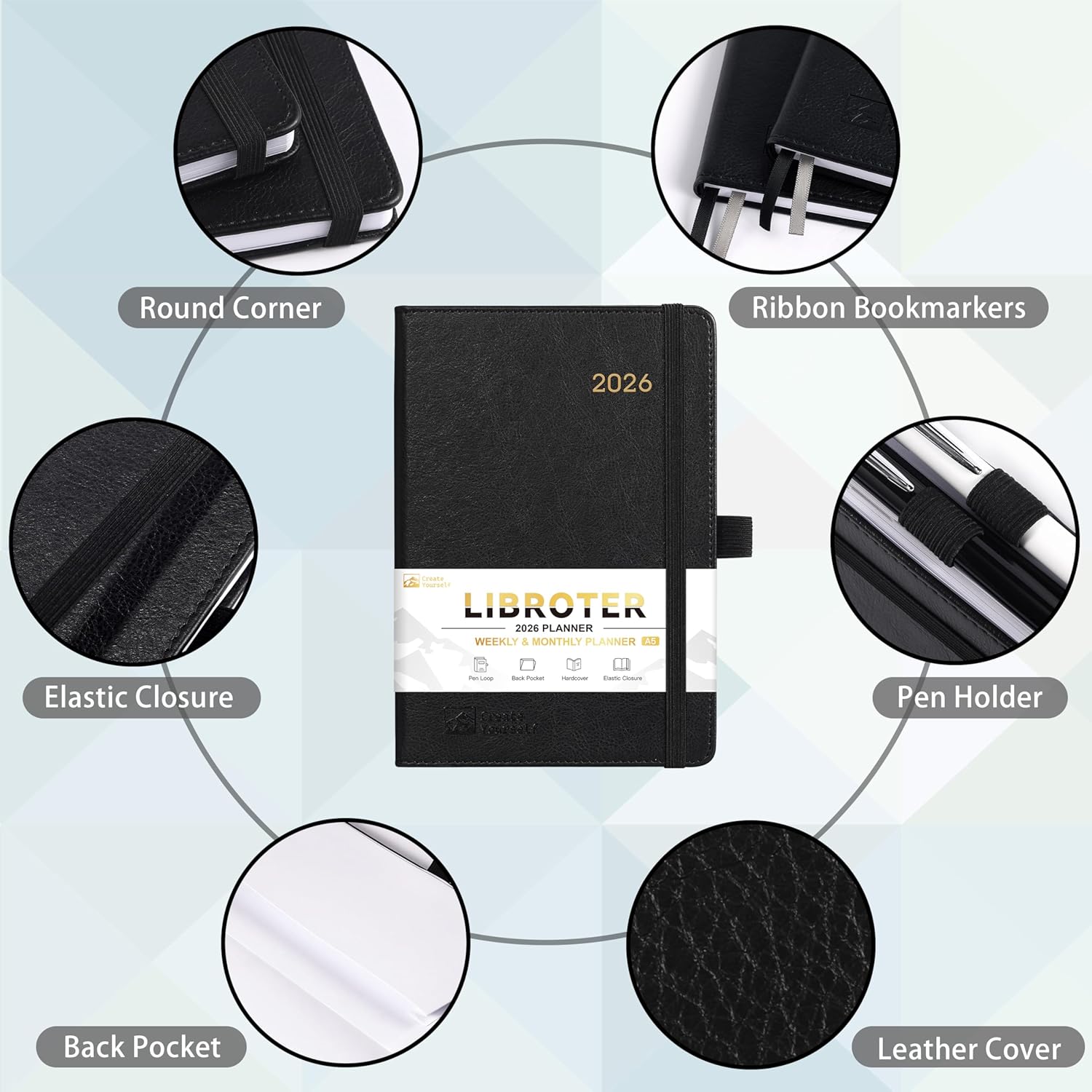 2026 Planner - Planner 2026, 2026 Weekly Monthly Planner, Jan.2026 - Dec.2026, 5.7'' x 8.4'', Thick Paper, Leather Cover, Pen Holder, Back Pocket, Bookmarks, Perfect Daily Organizer - Black