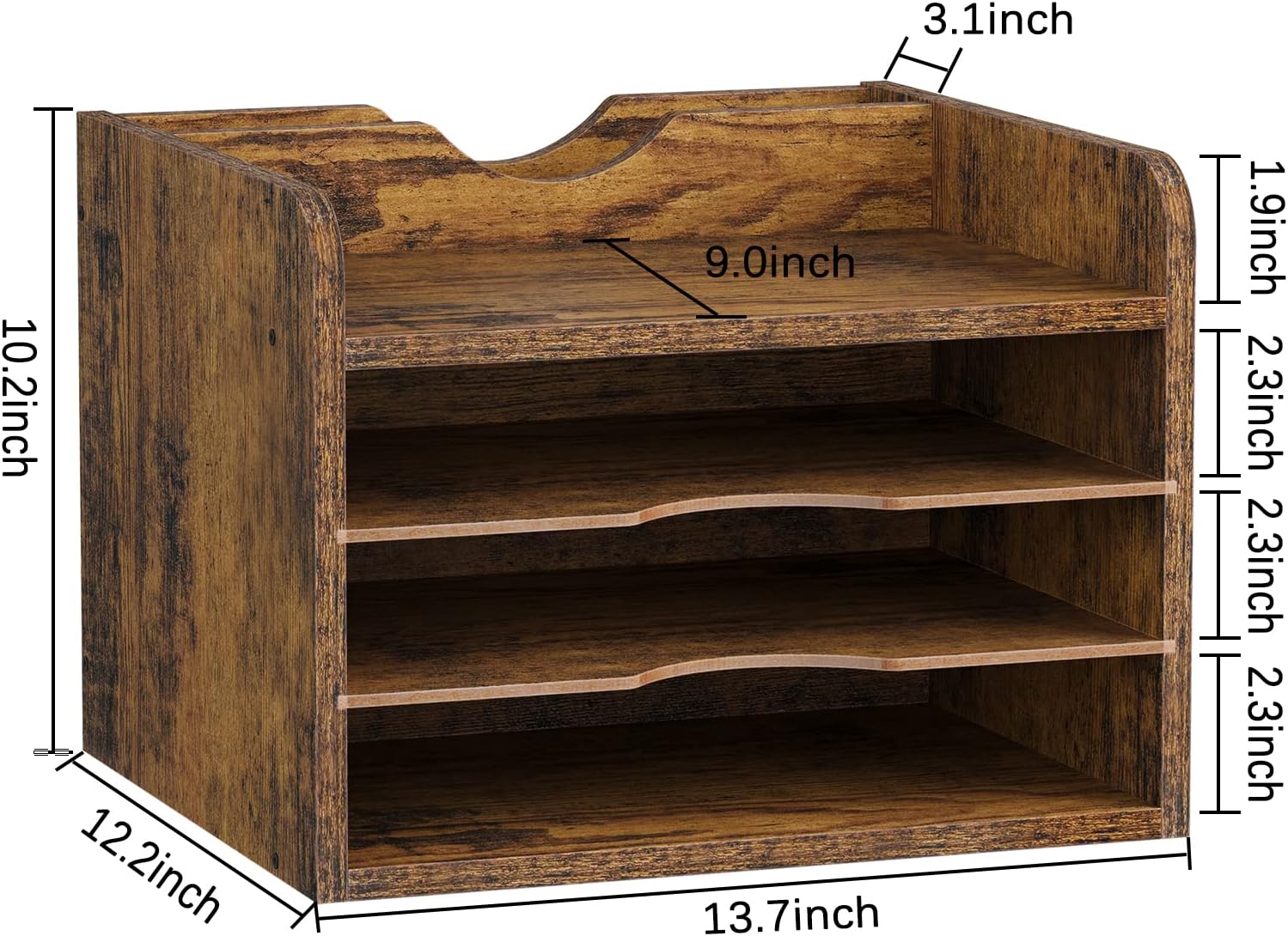 Snughome Vintage Wood File Organizer Desktop, 13.7‘’ Document Letter Mail Tray Sorter with 3 Adjustable Shelves, Wooden Desktop Paper File Sorter Holder for School Home Office Supplies (Rustic Brown)