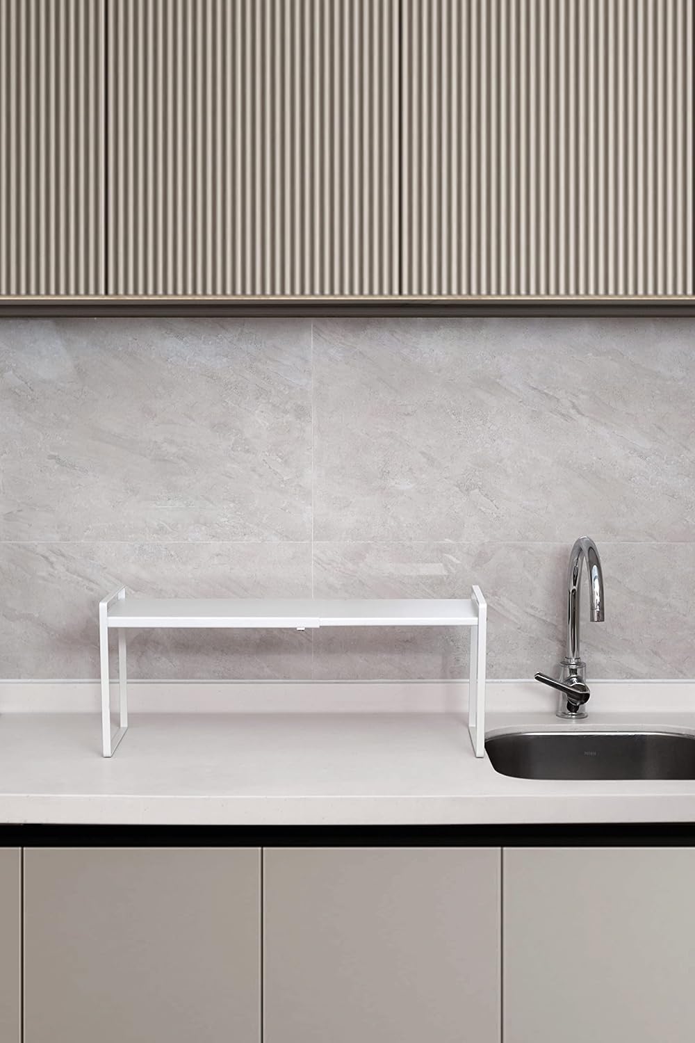 - EXPANDABLE: You may expand the width of this freestanding cabinet shelf to your desires. It can easily vary from 13.4 inches to 24.5 inches in width depending on how you want to organize your space. Specification: 10.3’’D * 13.4-24.5’’W * 9.5’’H