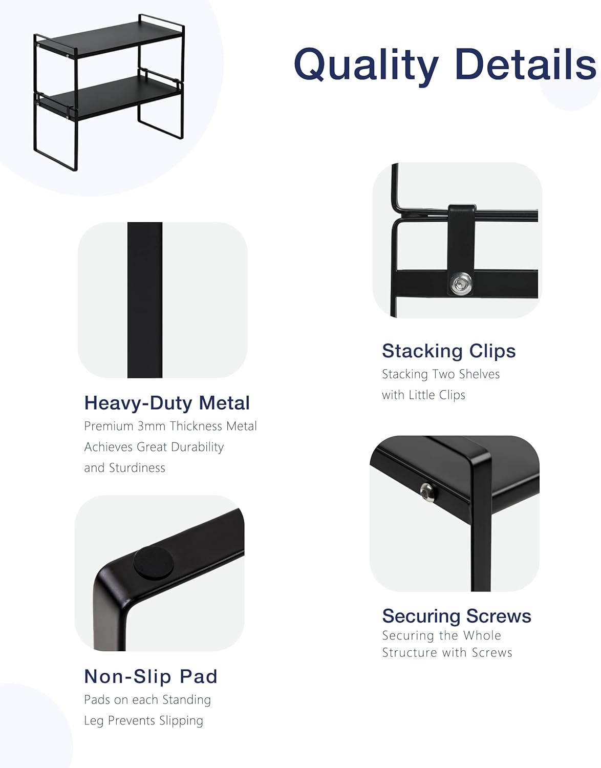 - STACKABLE: The product comes with two sets of cabinet shelves where you can stack one on top of another, creating 2-tiers double space to store household items under, in between or on the shelf. They are perfect to use as storage organizers in kitchen, cabinet, pantry, cupboard, and anywhere in your home or office for that wonderful extra storage space.