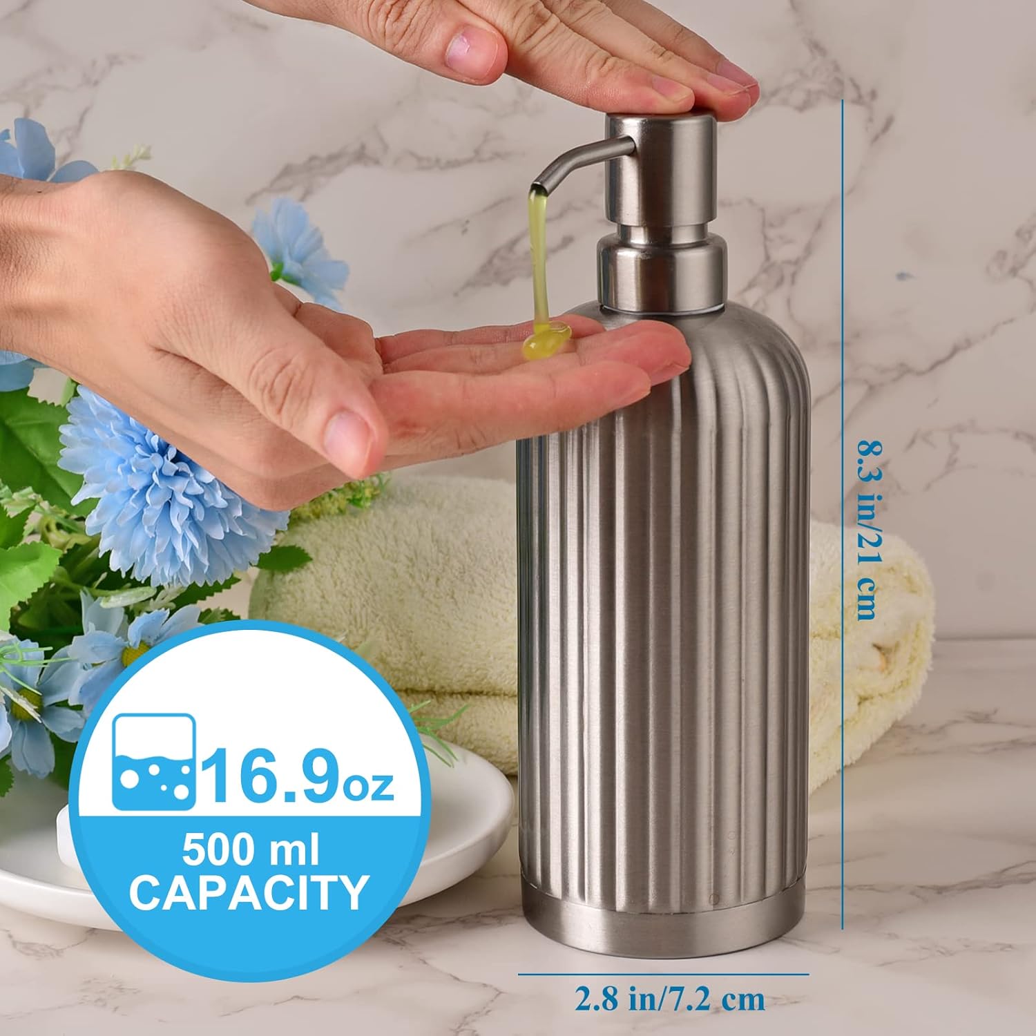 - ⭐ELEGANT ACCESSORIES - With a unique vertical stripe design made of brushed stainless steel, this soap dispenser is sturdy and lightweight, with a clear coating to prevent fingerprints. Ideal design to blend into any home decor