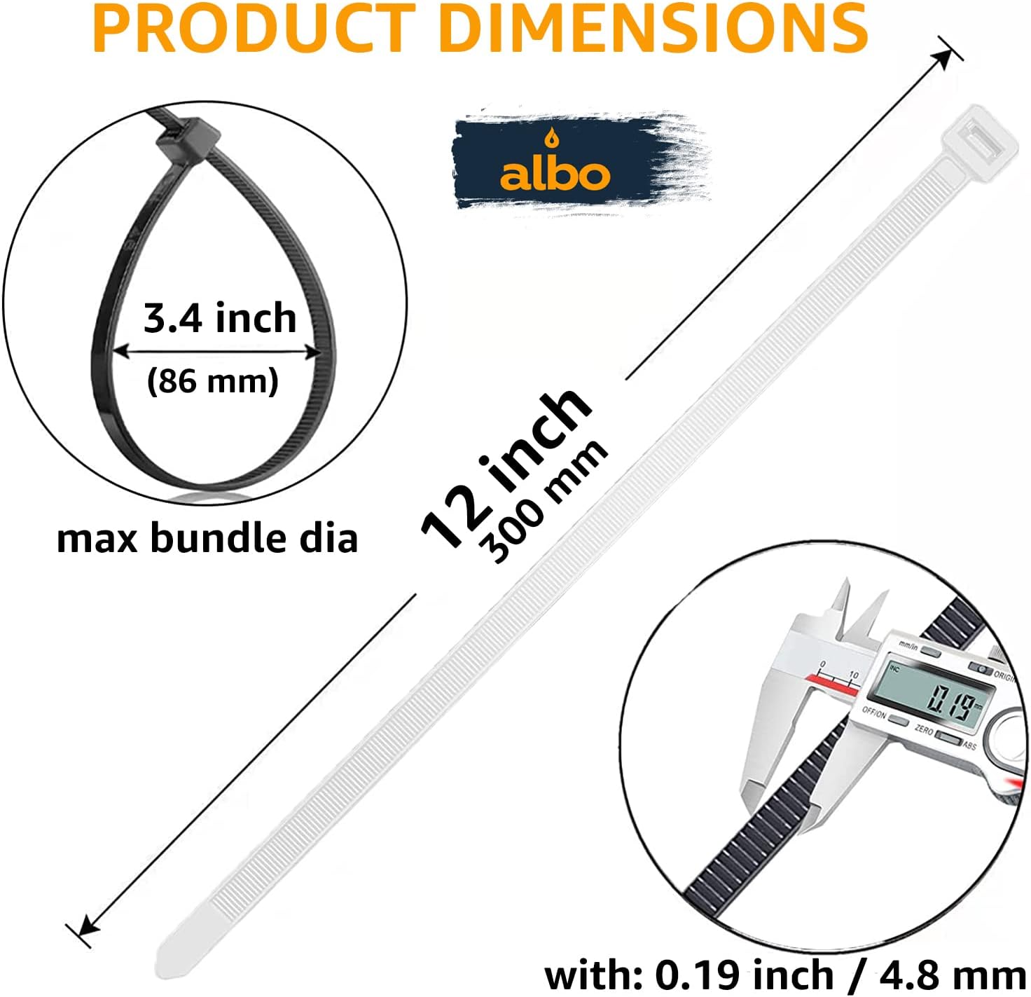 - Optimal Size: White, clear zip ties 12 inch (300mm), 0.19 inches (4.8mm) in width, offer a robust solution for household fixes, handling up to 50 lb in tensile strength. Max bundle diameter: 3.4 inches (86mm).