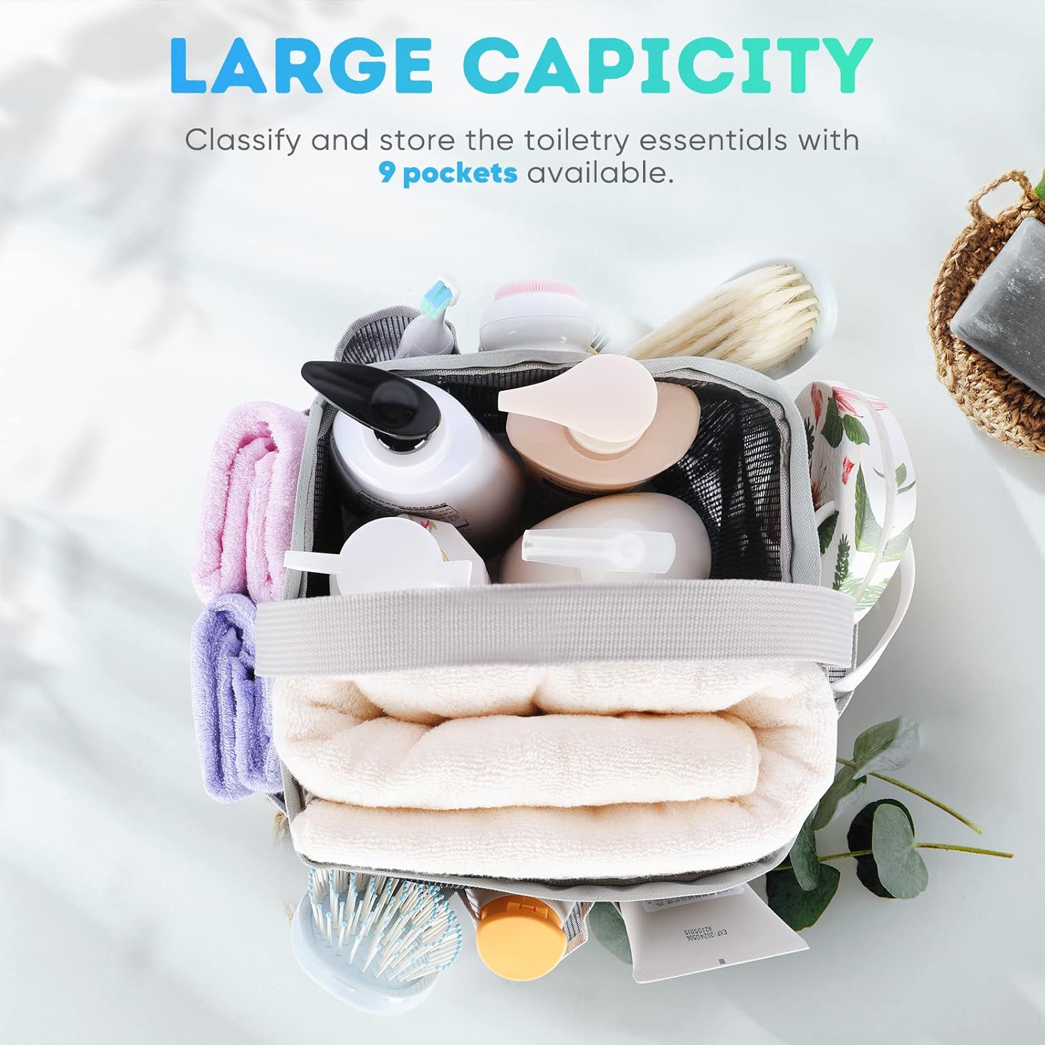 - Large Capacity with 8 Side Pockets:Side pockets serve to hold the toiletries like suncream, face cleanser, and other tiny pieces like sunglasses, shaver, comb, and more. In contrast, the main pocket offers ample space for shampoo, body wash, towel, clothes, hairdryer, etc.