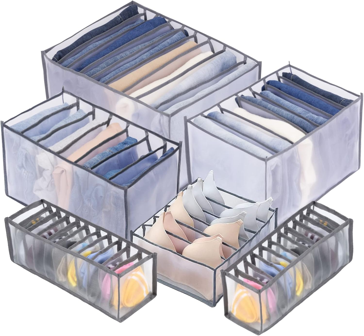 - There are 6 pcs clothes organizers in different sizes, which perfectly meets all your storage needs and solves most of the daily clothes storage problems. ( Jeans 9 Grids + Kids Jeans 7 Grids + T-shirt 7Grids + Bra/Underwear 6 Grids + Panties 11 Grids + Socks 11 Grids)