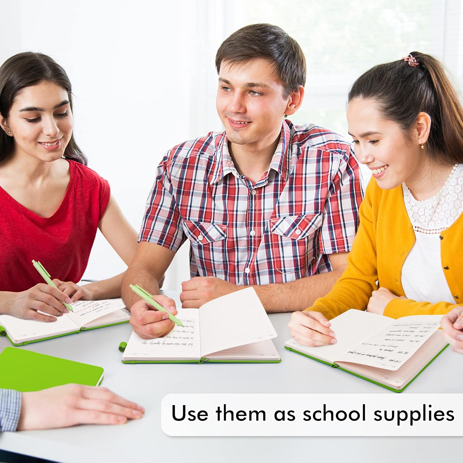 - Feela 24 Pack Classic Ruled Notebooks contains 24 green ruled sturdy cover notebooks and 24 Black Retractable Pens. Each of the notebooks measures 8.3” x 5.1”, which is perfect to carry and easily held by young girls and boys. These black cute pens are customized to be placed in the pen holder, which is pretty convenient.