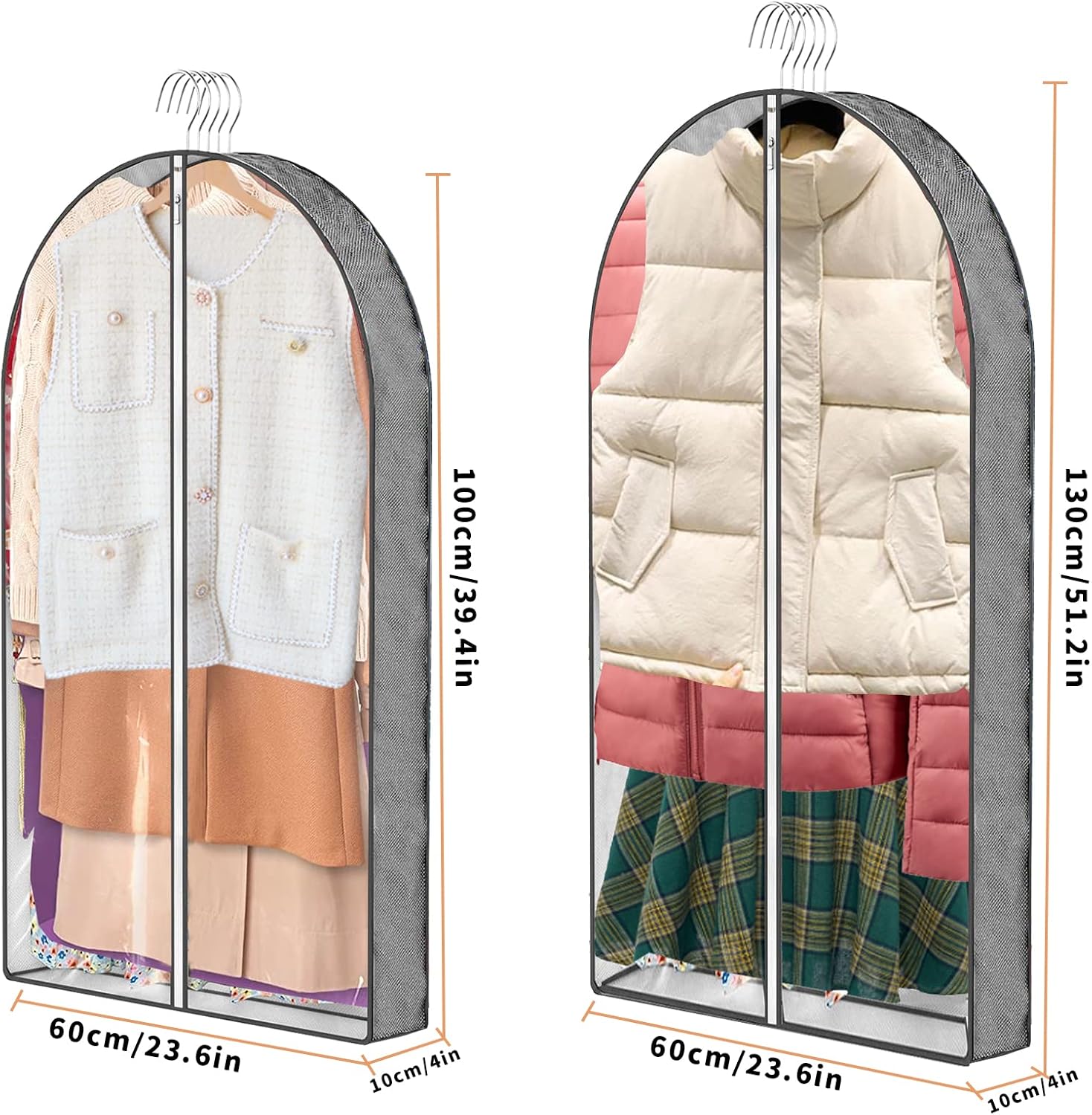 - 【CAN HOLD ENOUGH CLOTHES】:Our garment bags have two sizes 24"×40"*2 and 24"×50"*1. each garment bags has 4" gussetes, You can store as many clothes as you want these clothing bags for hanging clothes, and they will do it all