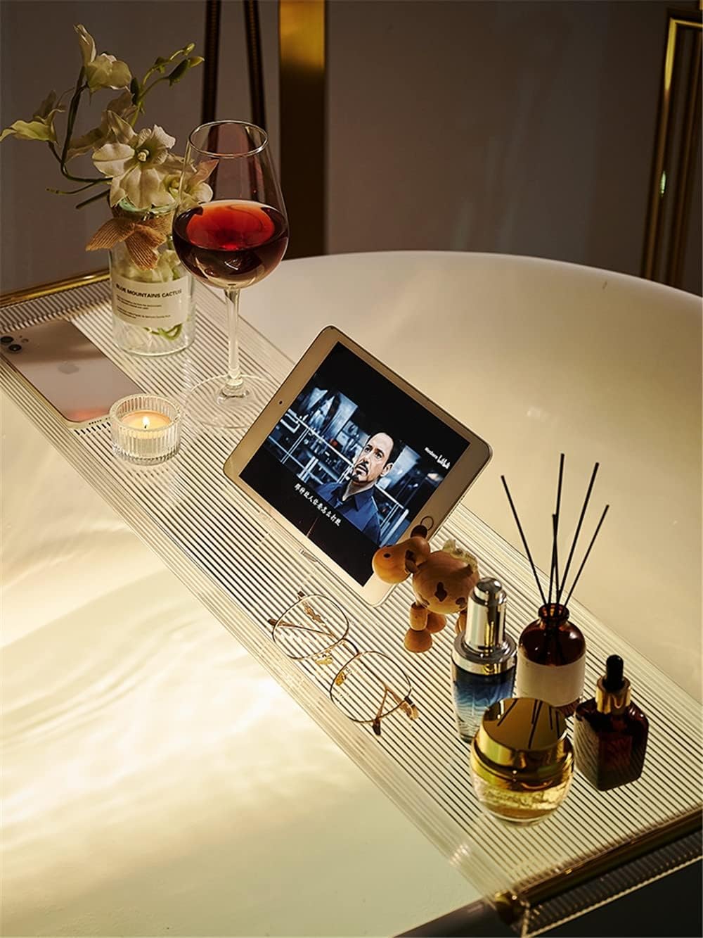 - Simple design,easy to clean : Our bath caddy was not made by wood,its material is acrylic,you can use water or soft cloth to clean any corner of bath tub tray.Do not hide the dust for this simple design,make life easy,really feel relax when bathing.