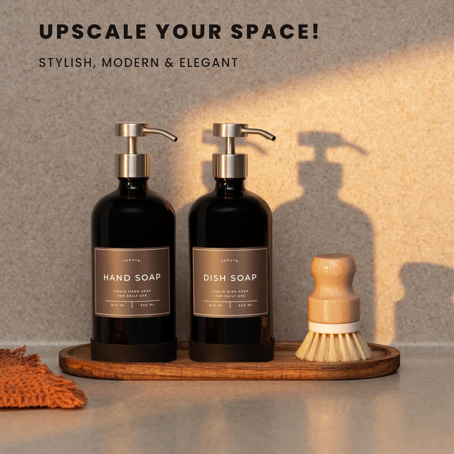 16oz Glass Soap Dispenser with Stainless Steel Pump, 21 Waterproof Labels, Non-Slip Protective Silicone Pad, Set of 2 for Bathroom & Kitchen (Gloss Black Bottle/Brushed Silver Pump)