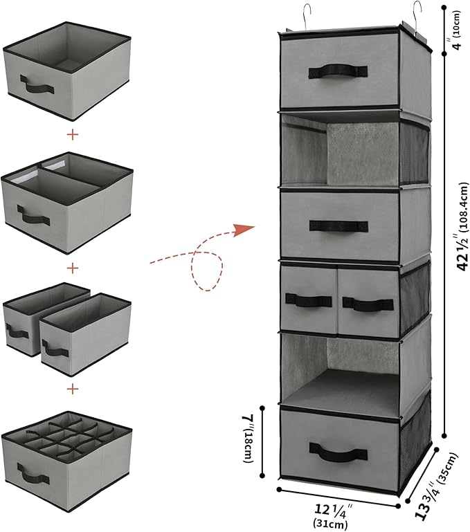 - 5 Versatile Removable Drawers: This hanging shelf features 5 removable drawers that can be used inside the unit or separately. Perfect for organizing baby clothes, bras, underwear, socks, and private essentials. Includes 1 large drawer, 1 drawer with removable dividers, 1 drawer with 12 square cells, and 2 small side-by-side drawers.