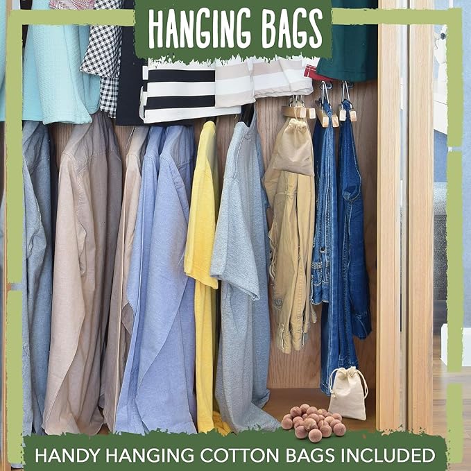 - MULTIPURPOSE & VERSATILE - Our scented cedar balls can be placed in drawers, closets, shelves, bags and more. As our balls are 100% natural, they can touch any fabric directly and won't stain or emit any smell on clothes. Our cedar wood planks for closets also reduce mustiness, absorb excess moisture and keep your wardrobe, as well as your favorite sweater, smelling delectably fresh! Simply put into the cotton bag sachets provided for the best experience.