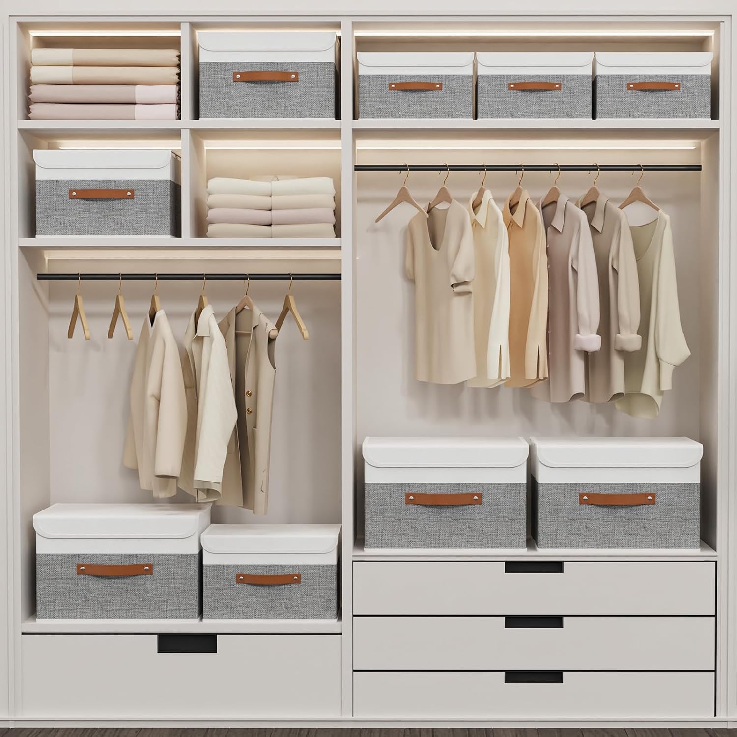 Yawinhe Storage Boxes with Lids, Linen Fabric Bin, Cube Organizer Basket, Washable and Leather Handle, for Home, Closet, White/Grey, 15.0''Lx9.8''Wx9.8''H, 7-Pack, USNK024WGL-7
