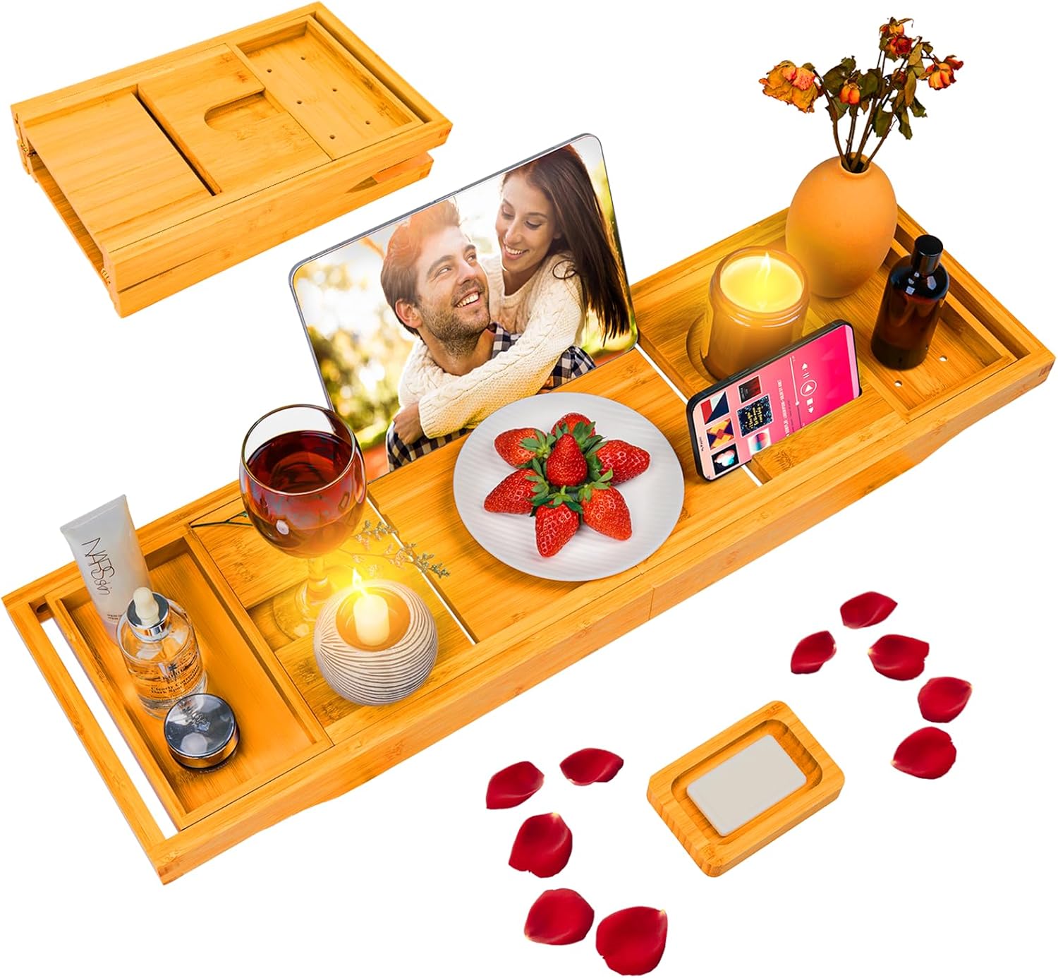 - LUXURY SPA FOR BATH: If your ideal way to destress begins with a warm bubble bath, you deserve to upgrade your bathroom for a more spa-like experience—and that's where a foldable bathtub tray comes in. This bath tray consists of many practical components which can meet all needs during your bath time. Everything you need will be right at your fingertips and you can do whatever you want even if you’re taking a bath. The bamboo bath tray made your bath time a spa day for yourself. And Adjustable and removable bamboo tray, fits most bath tubs