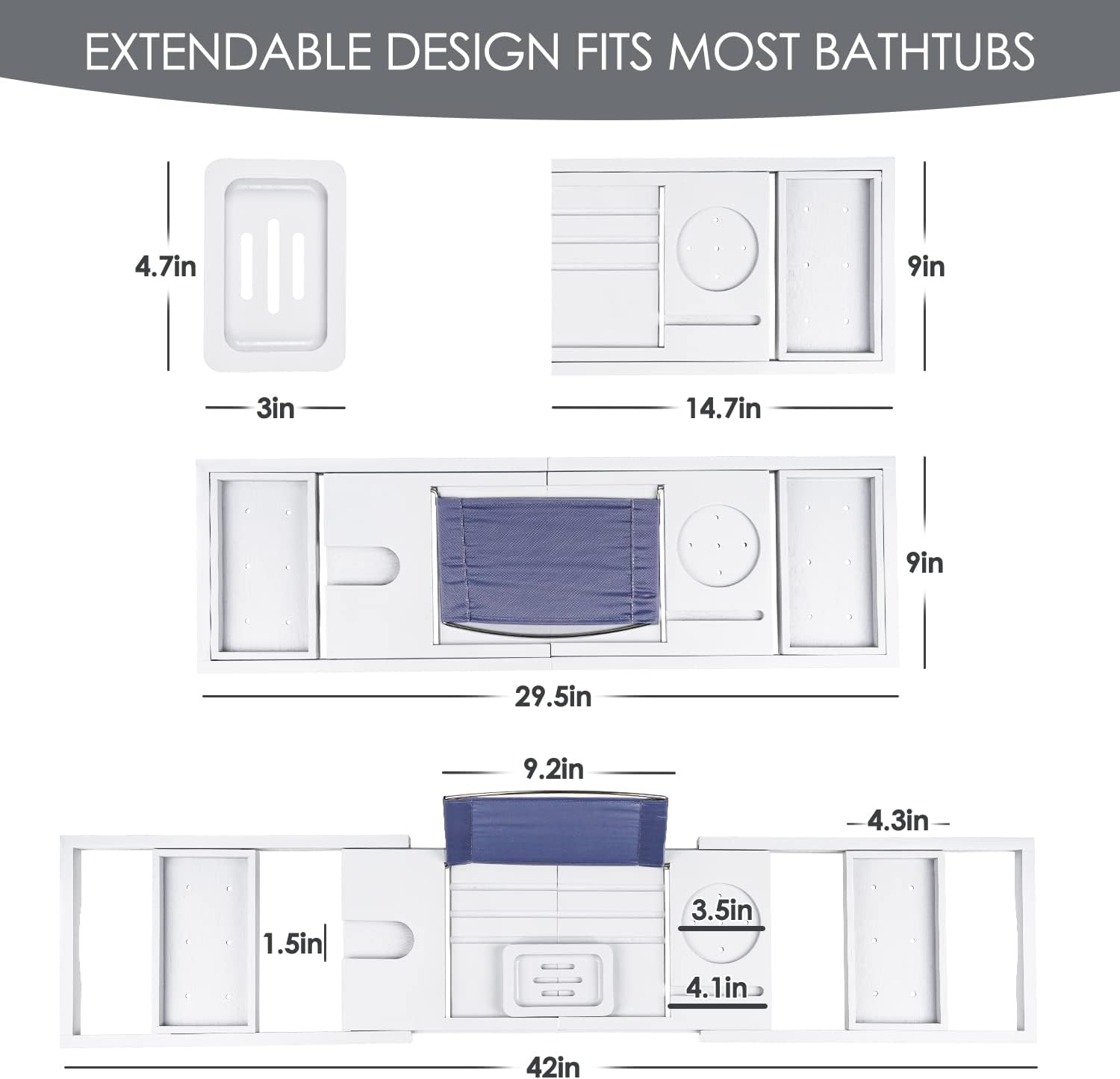 - ADJUSTABILITY&FITS MOST BATHTUB: The adjustable arms extend to fit wider tubs, so whether you have a compact soaking tub or a large freestanding model, this tray will fit. The non-slip pads on the base ensure the tray stays securely in place without damaging the tub surface. Plus, it’s incredibly easy to clean, just wipe down with a damp cloth. This bathtub trays for tub white has multiple compartments to organize all your bath essentials—featuring a drink holder, a phone slot for tub entertainment, a place for soap, and more