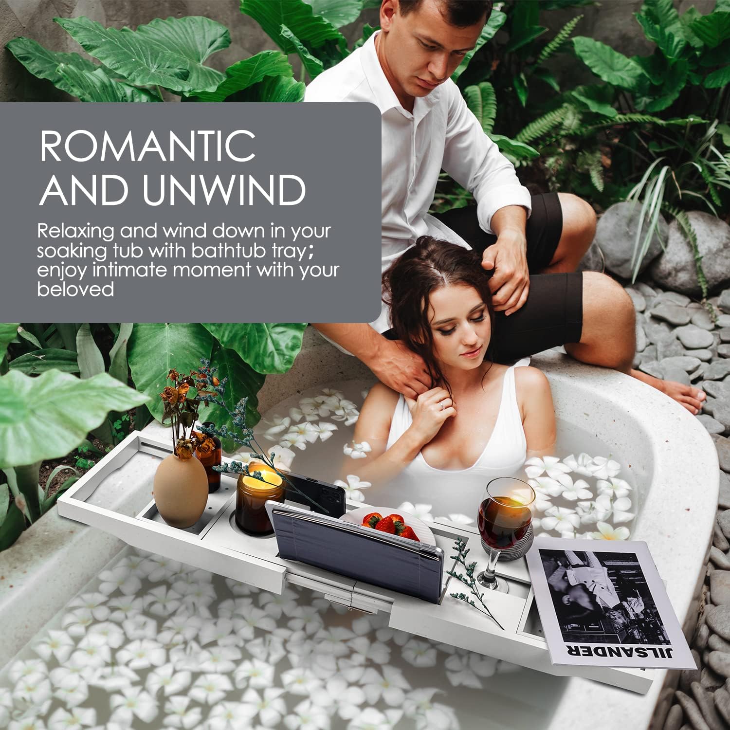 - LUXURY SPA FOR BATH: If your ideal way to destress begins with a warm bubble bath, you deserve to upgrade your bathroom for a more spa-like experience—and that's where a foldable white tub tray comes in. This bath tray consists of many practical components which can meet all needs during your bath time. Everything you need will be right at your fingertips and you can do whatever you want even if you’re taking a bath. The bamboo white bath tray made your bath time a spa day for yourself. And Adjustable and removable bamboo tray, fits most bath tubs