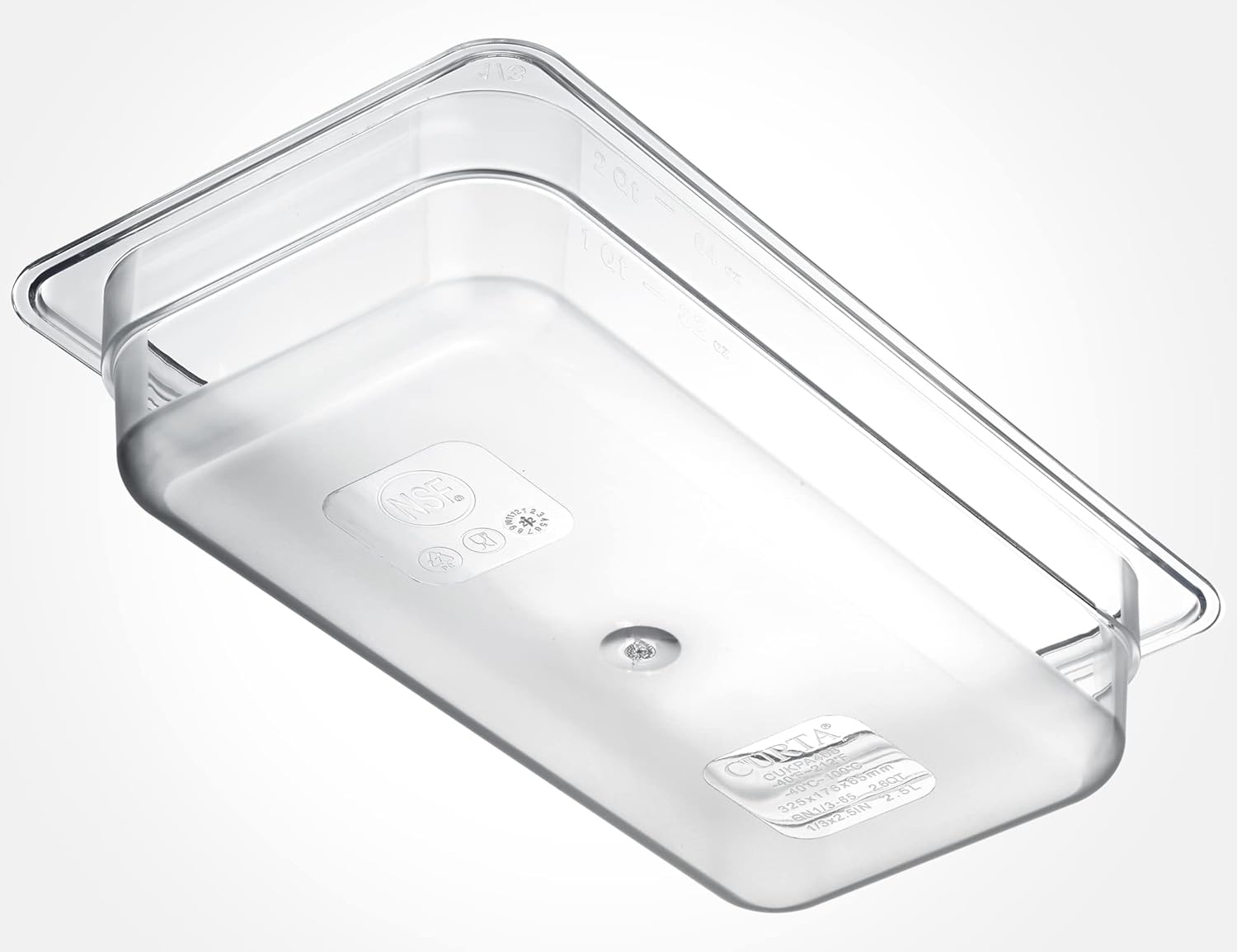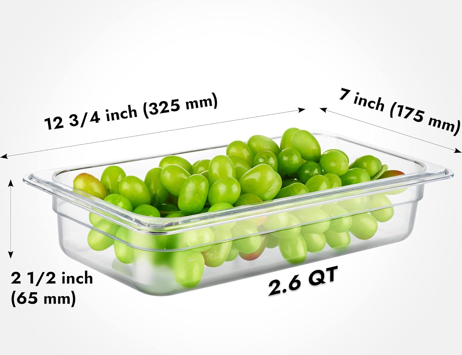 - 6-PACK SET - The set includes six 1/3 size 2.5 inch deep CURTA food pans measure approximately 12 3/4" (325mm) x 7 " (175mm).This pan is 2.5" (65mm) in depth and holds 2.6 quarts, allowing you to store and organize different food items in your fridge, freezer, or food warmer. Durable and high-quality polycarbonate material ensures long-lasting use.