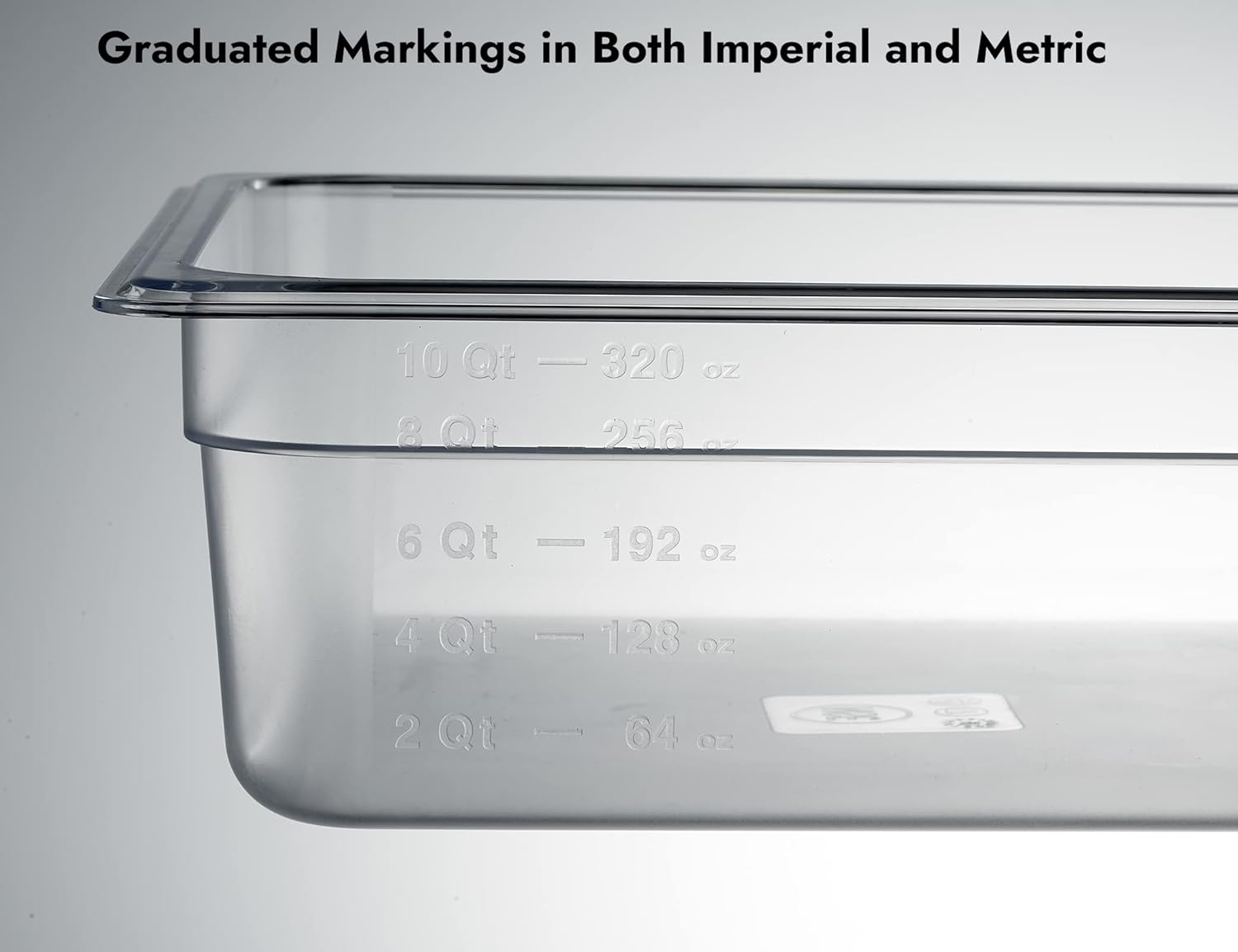 - UPGRADED MODEL - This model also boasts a scratch resistant textured bottom and edges. And the clear polycarbonate material of these food pans allows for easy visibility of the contents, making it easy to identify and retrieve the food items you need. These food pans are temperature-resistant, they can withstand extreme temperatures ranging from -40°F to 210°F, making them suitable for use in a variety of food service applications.