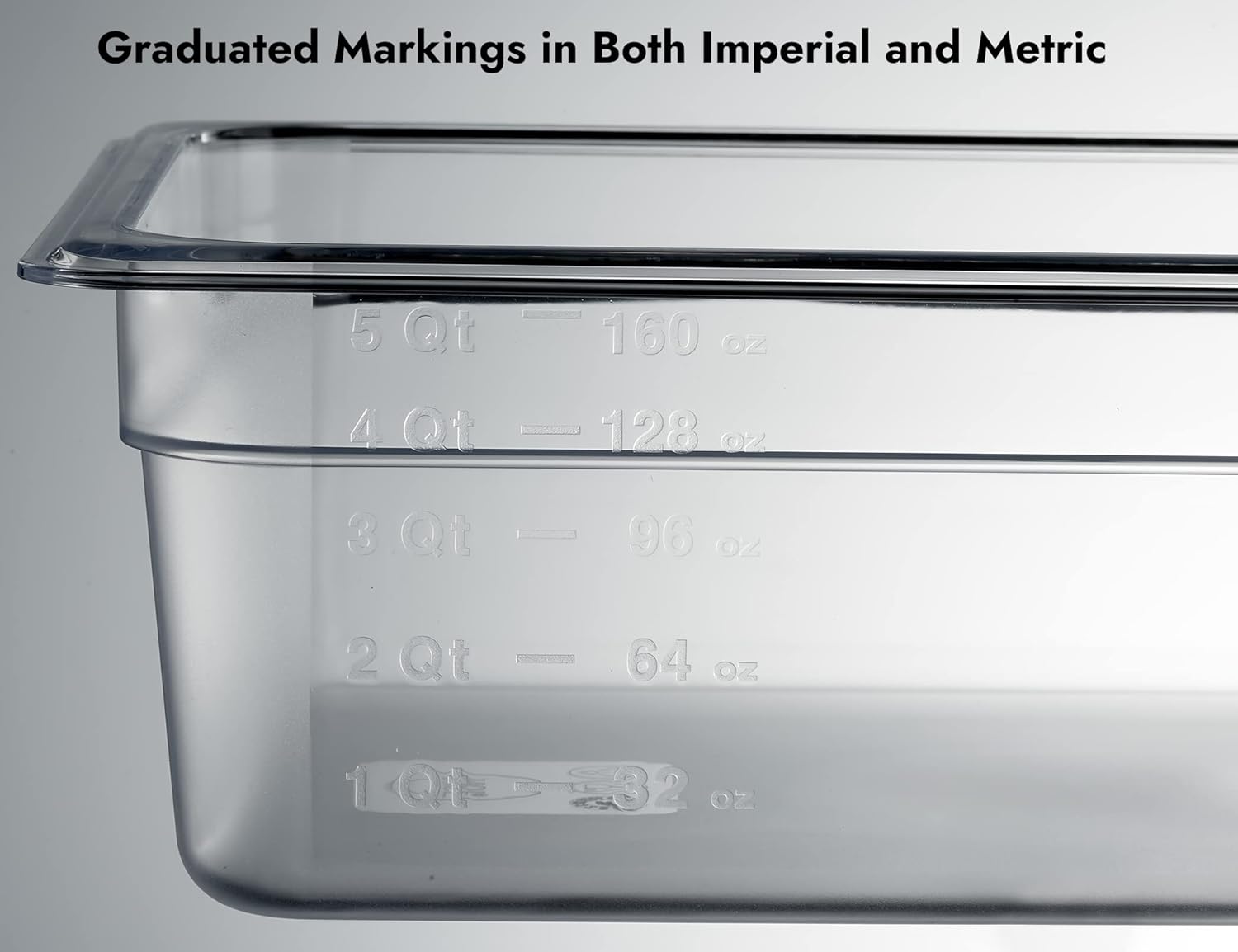- UPGRADED MODEL - This model also boasts a scratch resistant textured bottom and edges. And the clear polycarbonate material of these food pans allows for easy visibility of the contents, making it easy to identify and retrieve the food items you need. These food pans are temperature-resistant, they can withstand extreme temperatures ranging from -40°F to 210°F, making them suitable for use in a variety of food service applications.